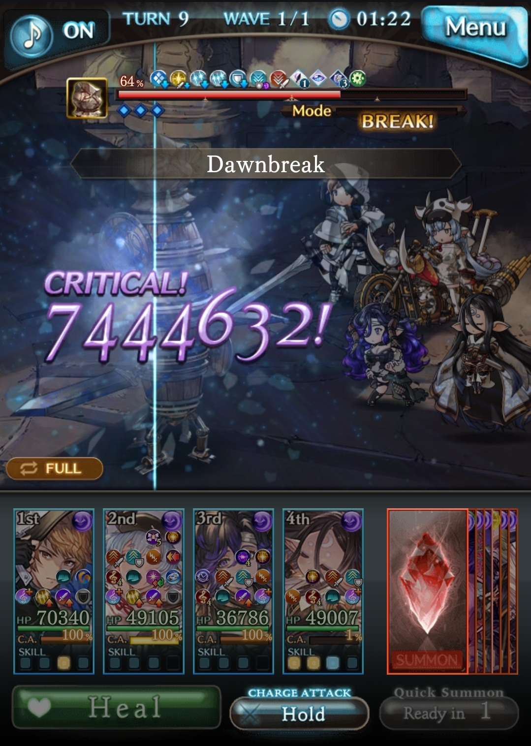 >>553812448Summon Hades if you haven't already, his charge bar gain gives you roughly 72% every turn, and with Dawnbreak proccing, you should complete this in about 4 turns.