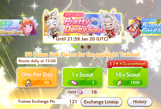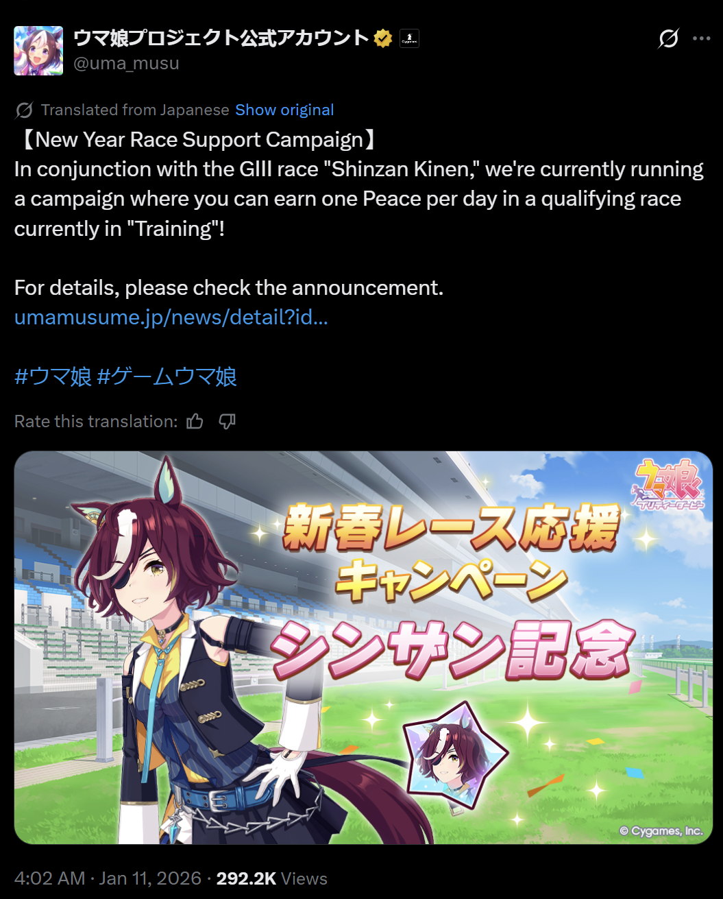 Previous: >>553789626>Global Game NewsLink your account to Cygames iDCurrent Scenario: Aoharu Hai aka "Unity Cup"Current Rate Up Trainee: Christmas Oguri Cap (3* alt), Christmas Biwa Hayahide (3* alt)Current Rate Up Support Cards: Narita Taishin (SSR), Mayano Top Gun (SSR)01/15 - Finemo 3*+Cafe SSR+Inari SR01/19 - Sagittarius Cup - Nakayama Turf 2500m01/22 - Tama 3*+Neicha SSR+Ogurin SSR - Legend Races01/27 - New Beginnings Part 101/29 - NY Opera & Haru 3*+Fuku SSR+Ayabe SSRMid February - Capricorn Cup - Chukyo Turf 1200mhttps://umamusume.com/news/100040/https://pages.snep.pw/uma/anni-skill-changes/>JP Game NewsCurrent Rate Up: Bubble Gum Fellow (3* Alt), Stay Gold (3*), Gentildonna (3*), Orfevre (3*), King Halo (SSR), Satono Diamond (SR)New Scenario "Yukoma Hot Spring" releasedTimeline: https://uma.moe/timelineCygames Webstore: https://webstore.cygames.com/en/umamusume_en/>Thread Clubshttps://rentry.co/umaglobalclublistYou must be E3 (20k points) to join a circle. Apply with /uma/ or /vg/ in your profile or post ID in the thread.>All Guides & Resourceshttps://rentry.org/uma26Game databasehttps://gametora.com/umamusume (Click the gear to switch between JP / global server info)A basic guide for newfagshttps://rentry.org/umaglobalFind networks if your region is blocked from the game or clienthttps://www.umavpn.top/93Seiyuu & Concertshttps://rentry.org/umstUma Texthttps://umareader.idsmile.xyz/