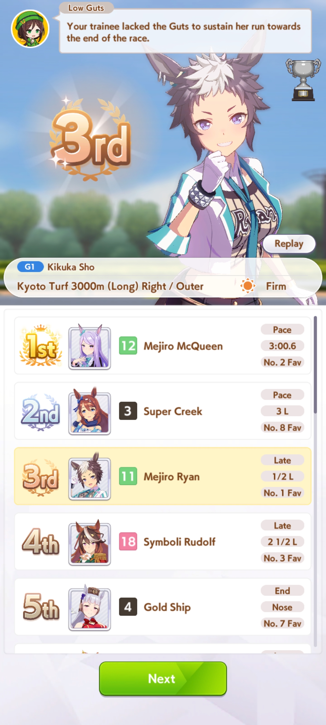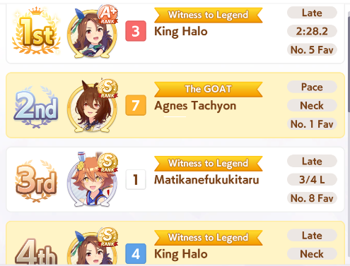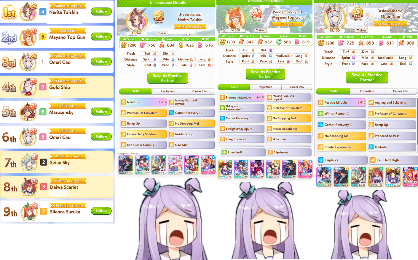 >>553812281>>553812205I have enough runs to know when horse is bad and in this case xoguri is rancid umashit. I've tried almost every combination.You need >1200 speed>800 stam not to gas>700 witWhich is bloody hard