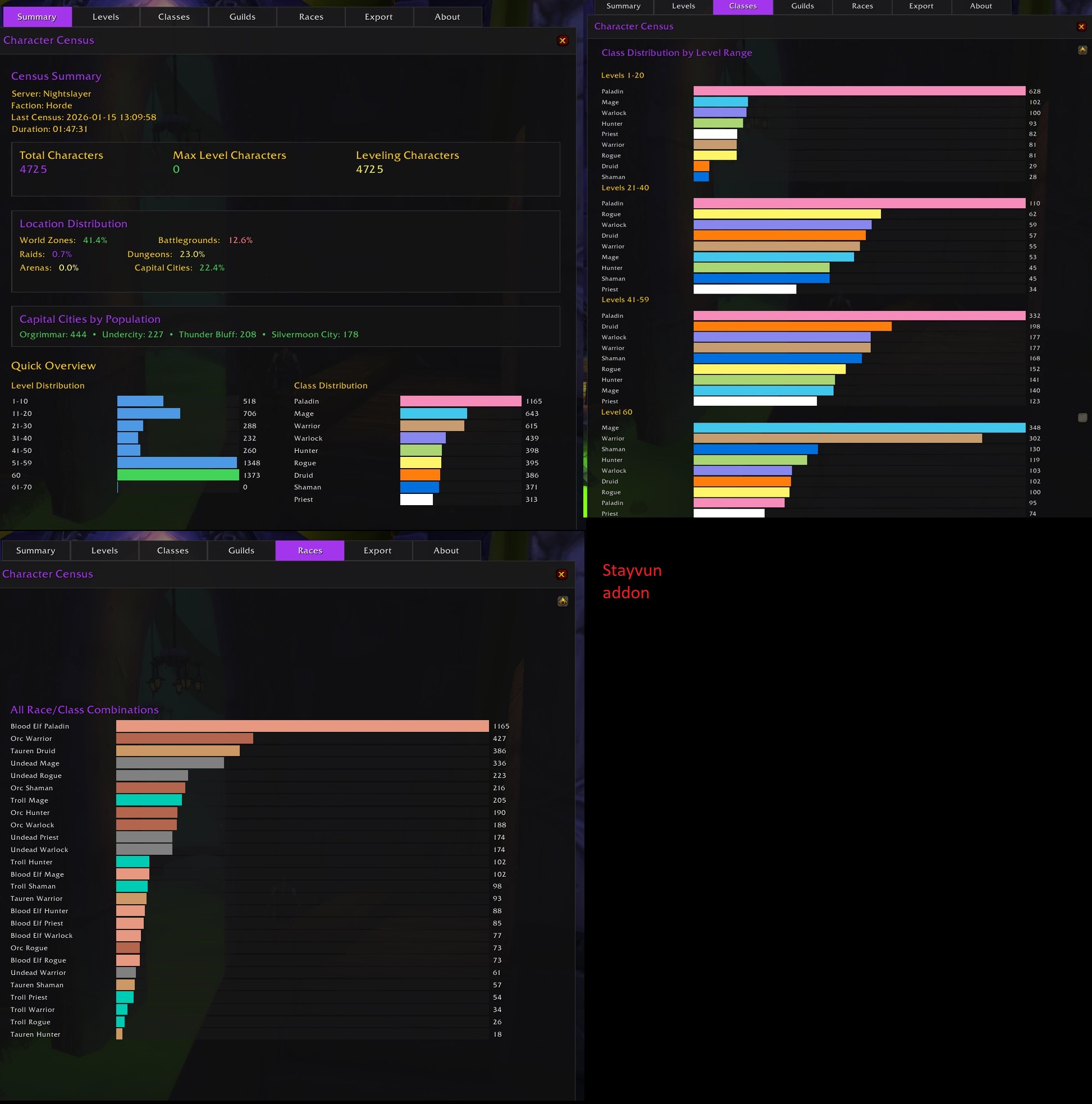 Nightslayer Horde Census snapshot. Dunno about making a paladin brothers. Also, holy hecking boosters/Tauren hunter rare based choice? Priest for the instant raid invite if that is your thang. lvl60 mage bots going strong.