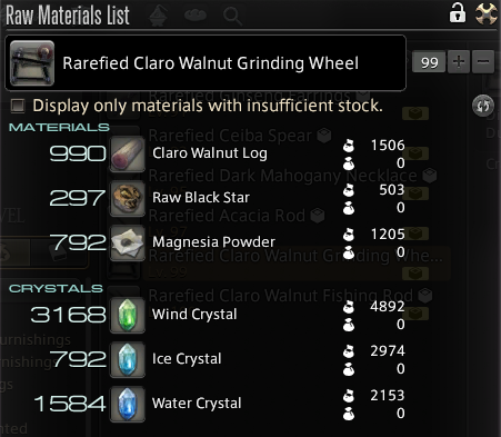 21000 purple crafter scrips..................130~ grinding wheels.I'm about to spend the next 3 hours crafting holy shit. Making my own set of crested gathering gear from start to finish without the MB was not wise.