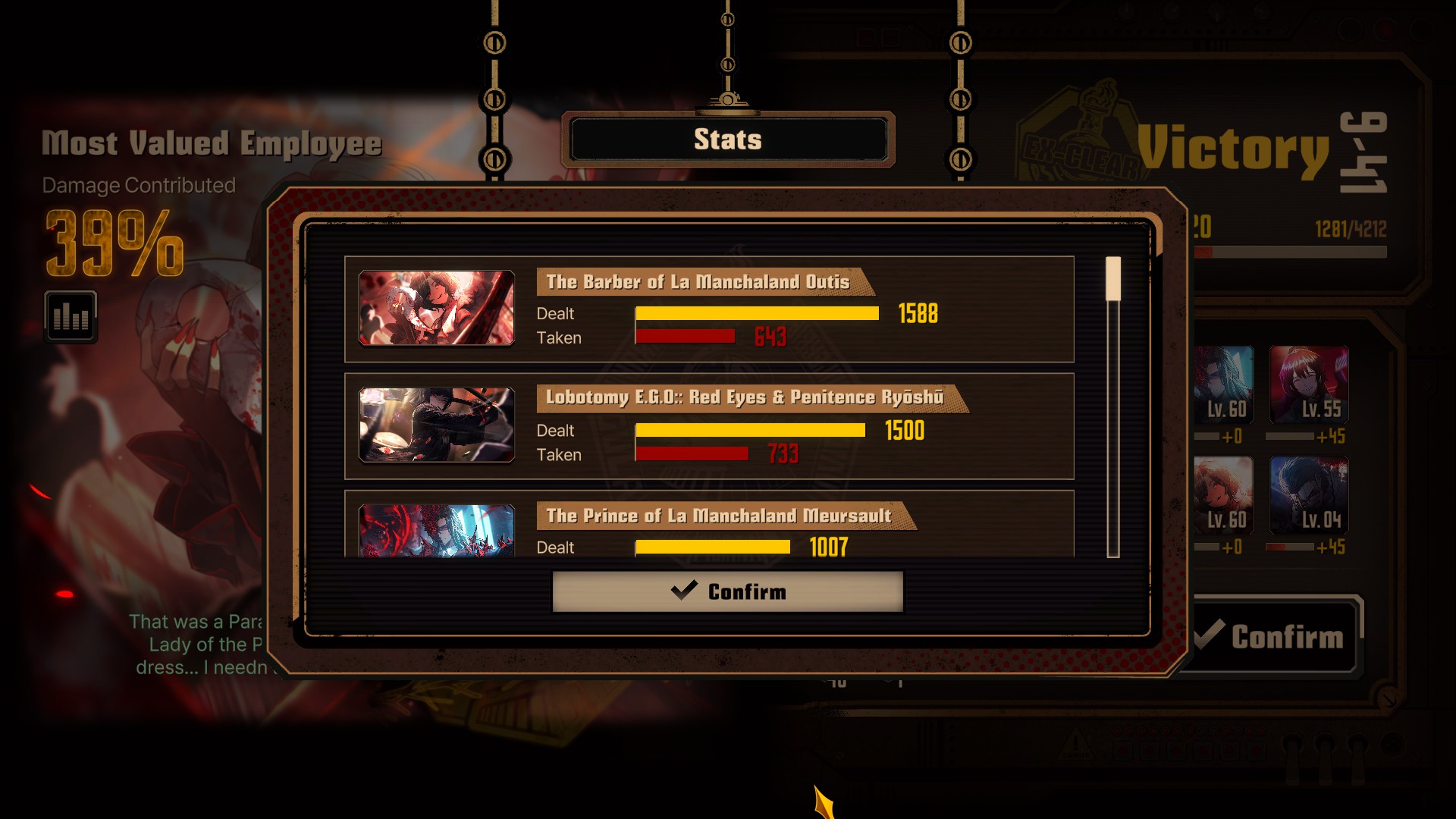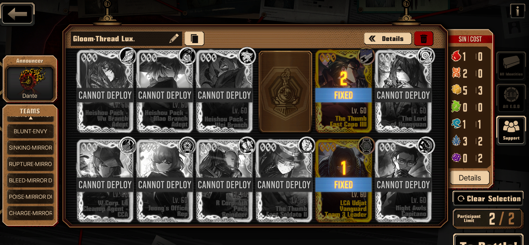I'm getting filtered by the Dihui Star boss fight in part 3. The lack of sustain (only healing egos I have are Pursuance meur (ryoshu heal won't matter she's immortal as long as the 2 are alive), self heal (12 hp) from Outis new zayin ego, and ReP Ryoshu heals. The fight is TOO LONG and the unbreakables/ extra damage (like the needle and thread ego gift) from Dihui just wears my team down. First try I made it up until Dihui never regenerates shield anymore and the carriage icon appears (I guess I just gotta reduce her HP to 20-30%) but my meur is dead at that point.Meanwhile the Middle fight is so easy I barely managed to use the Ampules (getting carried by LCD).