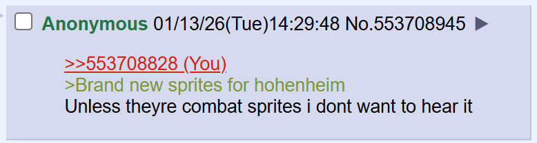>>553891869female posters contactt me on d/scord : aykuz0kmore so if you're down for vidya, lolis, anime, kemonos, art , creative stuff.things like AVGN, Pokemon, Fate, Dragon Quest, Monster Hunter, Bravely Default, Fire Emblem, Limbus Company, Final Fantasy, Digimon, Disgaea, Monogatari, Megaman, RWBY, Touhou, /m/ andn more