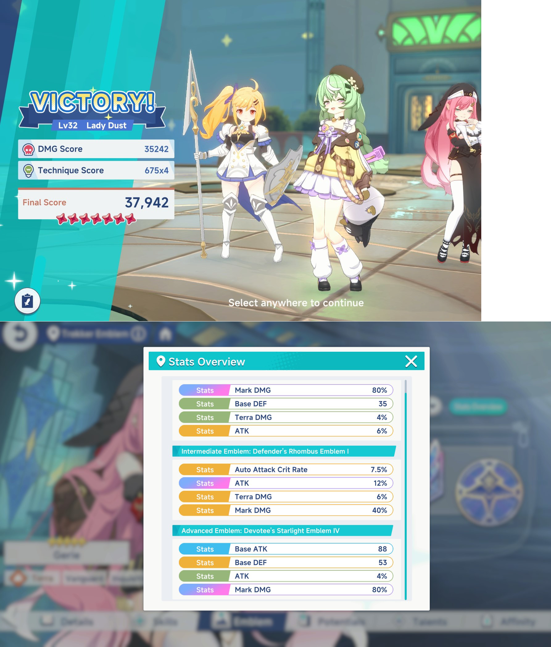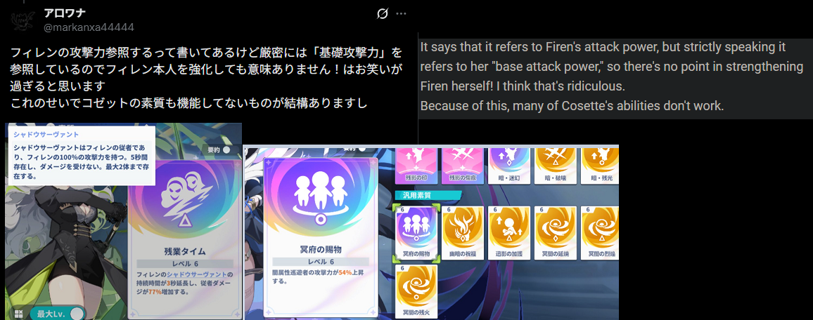 >>553884819>important!during gameplay make sure you only pop Tillia's Skill when Gerie's Skill is up. You also gotta realt boss' patterns because if you pop Getie's Skill and boss moves away form it, you lose a huge amount of DPS.>emblemsIn terms of Emblems, get that rainbow Mark DMG on the second emblem, it makes a big difference over the gold one.Now, for refining, try to get the following. Massive DMG increase.Geerie - Twilight's Verdict +3Nazuna - Main skill Level up +3; Touch of Nature +3Tillia - Blinding Beam +3 > Trick boost +3Getting just One or 2 of those on your emblems will give you a big Boost on dmg.In terms of build pic rel is more than enough