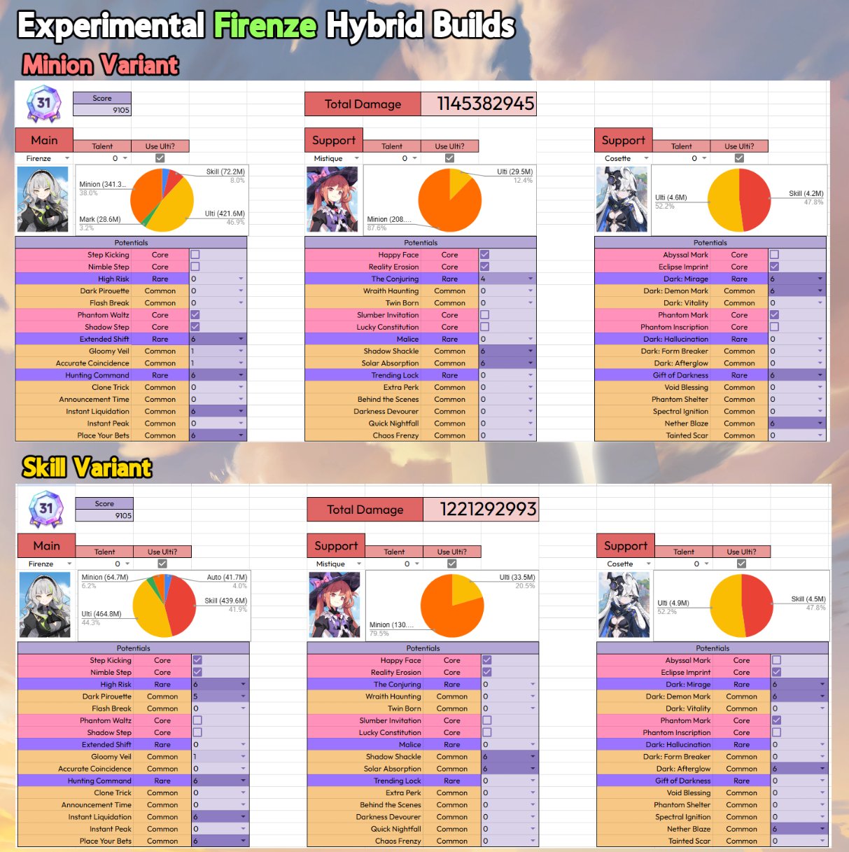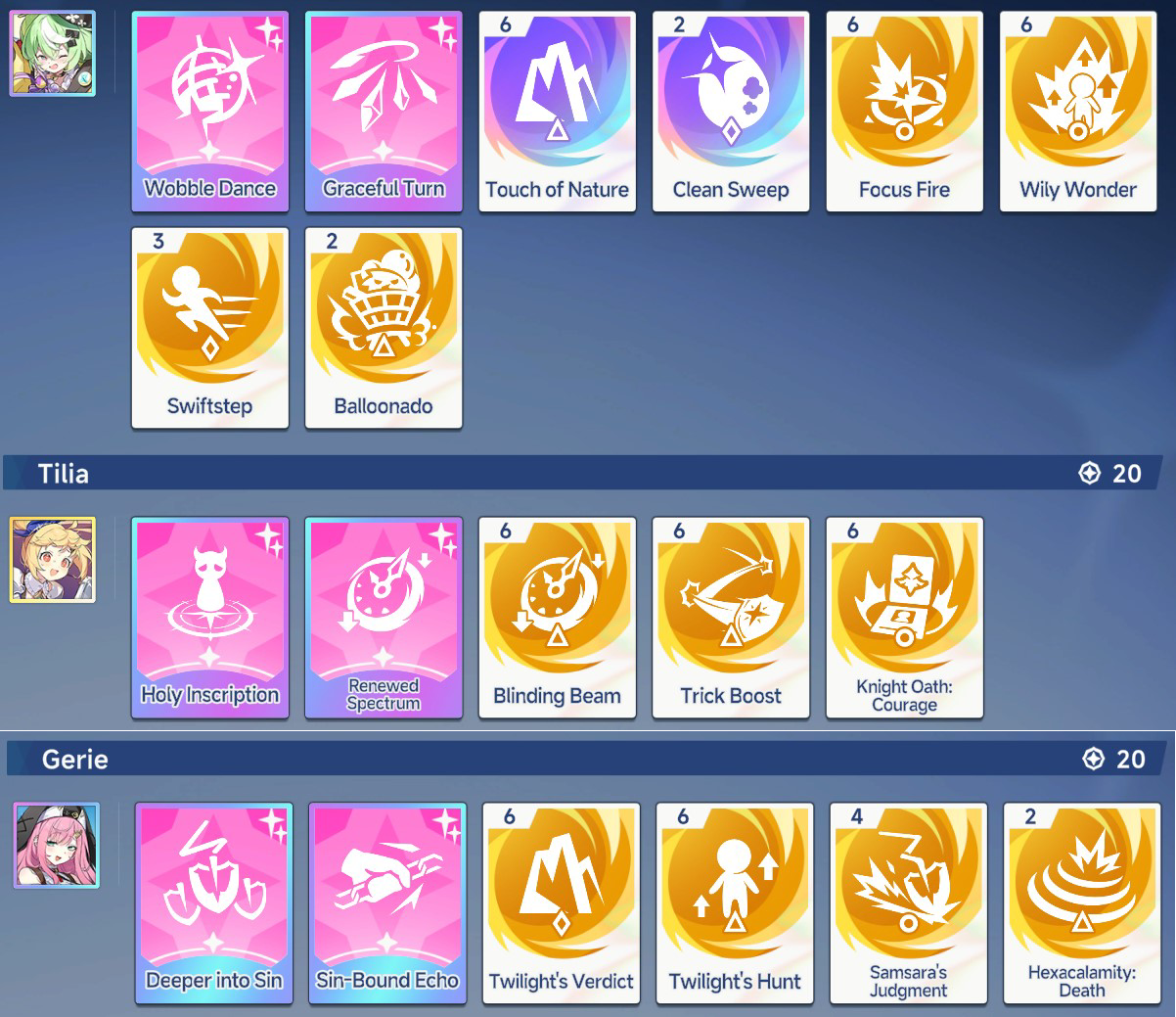 >>553885329Nazuna - you really need Cutie's Rally (6) instead of Swiftstep and BallonadoGerie - Anima Resonace (6) and Hexcalamity: Famine (1) instead of Samsara's Judgment and Hexcalamity:deathTilia - Perfect. Knight Oath is low prio, but if you get it to (6) it's always welcome as long as you got Gerie and Nazuna's pots right.Your current pots are making you miss a fair chunk of DMG imo