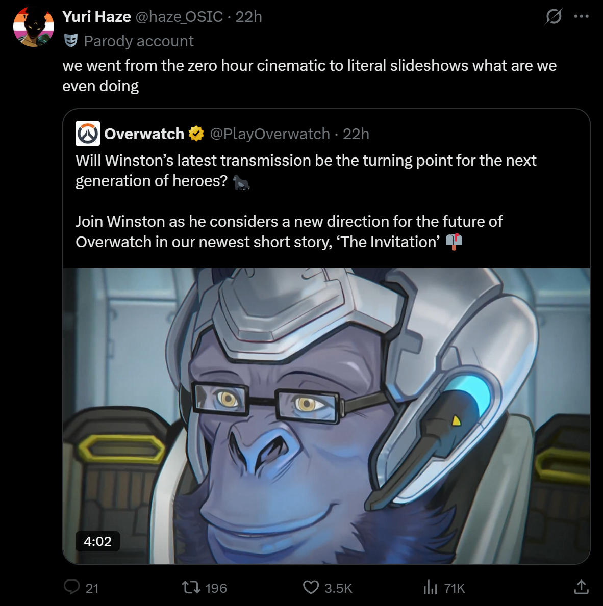 >>553924470I think Overwatch is genuinely going to kill it's Western audience. All of the people I called dick riders are now praising rivals and some of the accounts I follow are unironically now Deadlock stan accounts like pic rel. The sentiment around Anran and the Kirikos is not good lmao.
