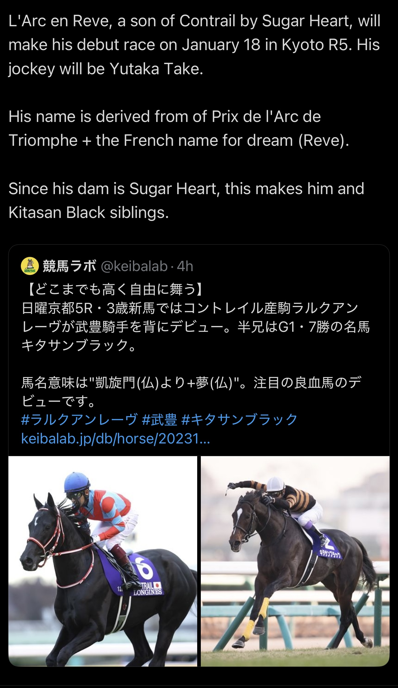 >>553928010Kitasan’s half brother and son of Contrail, L’arc en Reve >>553907265