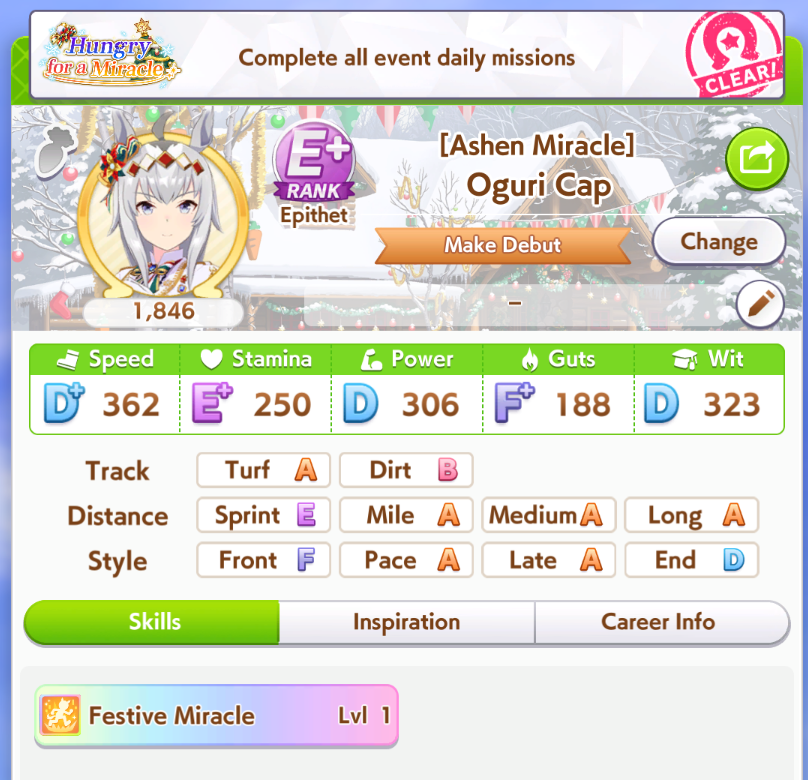 Previous: >>553879669>Global Game NewsLink your account to Cygames iDCurrent Scenario: Aoharu Hai aka "Unity Cup"Current Rate Up Trainee: Christmas Oguri Cap (3* alt), Christmas Biwa Hayahide (3* alt)Current Rate Up Support Cards: Narita Taishin (SSR), Mayano Top Gun (SSR)01/15 - Finemo 3*+Cafe SSR+Inari SR01/19 - Sagittarius Cup - Nakayama Turf 2500m01/22 - Tama 3*+Neicha SSR+Ogurin SSR - Legend Races01/27 - New Beginnings Part 101/29 - NY Opera & Haru 3*+Fuku SSR+Ayabe SSRMid February - Capricorn Cup - Chukyo Turf 1200mhttps://umamusume.com/news/100040/https://pages.snep.pw/uma/anni-skill-changes/>JP Game NewsCurrent Rate Up: Bubble Gum Fellow (3* Alt), Stay Gold (3*), Gentildonna (3*), Orfevre (3*), King Halo (SSR), Satono Diamond (SR)New Scenario "Yukoma Hot Spring" releasedTimeline: https://uma.moe/timelineCygames Webstore: https://webstore.cygames.com/en/umamusume_en/>Thread Clubshttps://rentry.co/umaglobalclublistYou must be E3 (20k points) to join a circle. Apply with /uma/ or /vg/ in your profile or post ID in the thread.>All Guides & Resourceshttps://rentry.org/uma26Game databasehttps://gametora.com/umamusume (Click the gear to switch between JP / global server info)A basic guide for newfagshttps://rentry.org/umaglobalFind networks if your region is blocked from the game or clienthttps://www.umavpn.top/93Seiyuu & Concertshttps://rentry.org/umstUma Texthttps://umareader.idsmile.xyz/