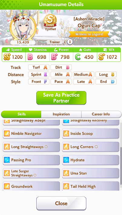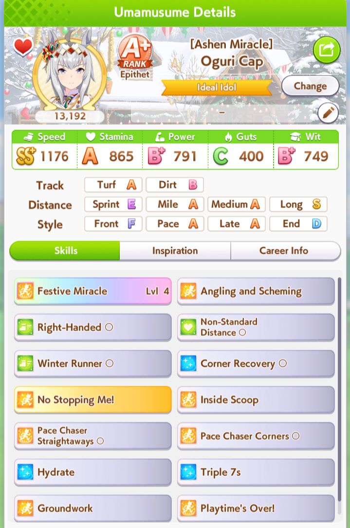 Hanukkah oguri is too big brained for me. What skills do I put on her for long cm?