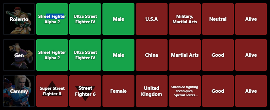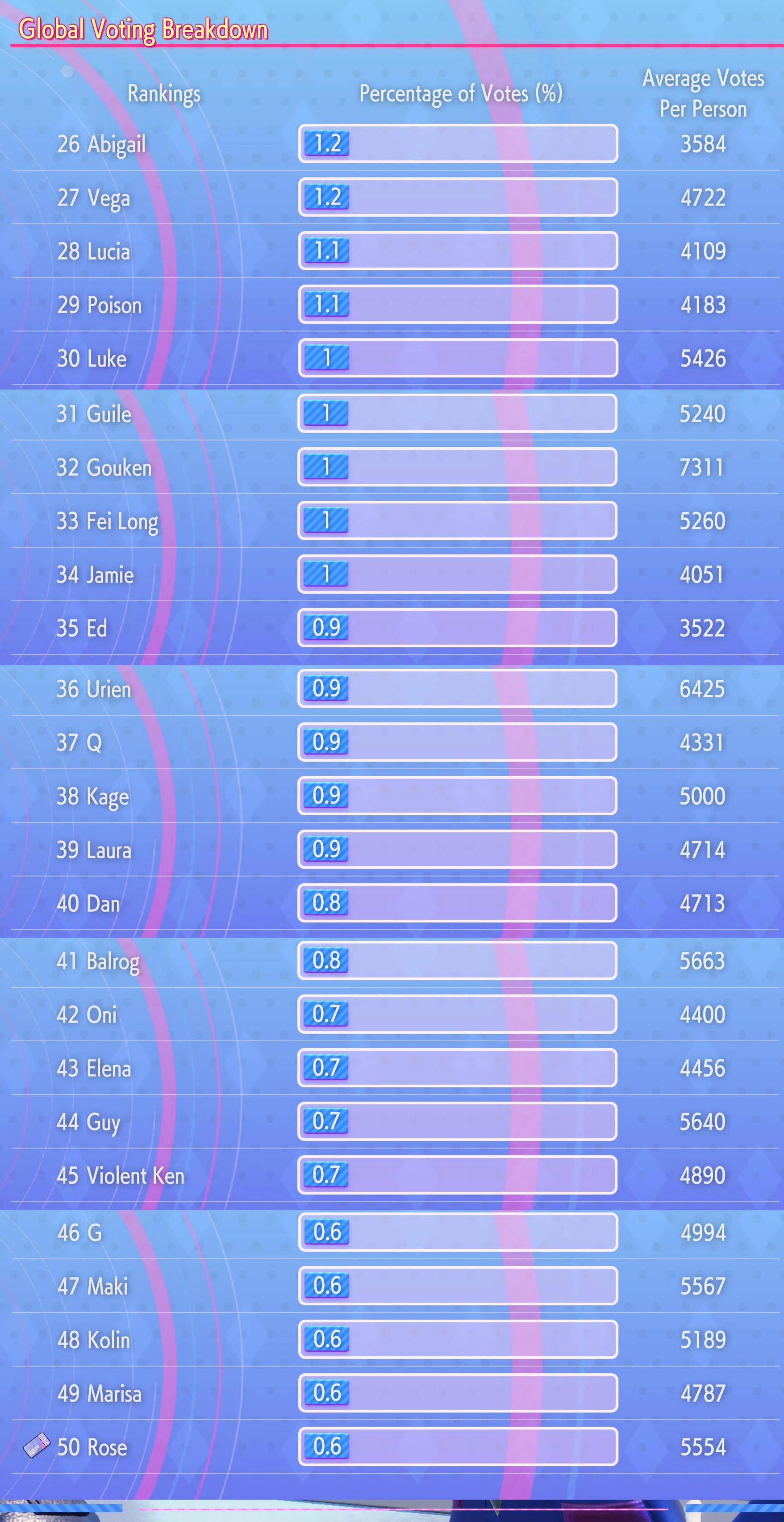 >>553940316Vega, Balrog, Fei Long, Dan, Rose, Mika, Cody, Karin, Sakura, Rose, Evil Ryu, Urien, Ibuki, Makoto, Gouken, Poison, Laura, Menat, G and SFEX guests.