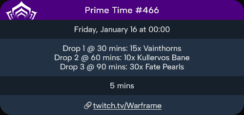 >https://twitch.tv/WarframePrime Time #466 live in 5mDrops:1. 30m - 15x Vainthorns2. 60m - 10x Kullervos Bane3. 90m - 30x Fate Pearls
