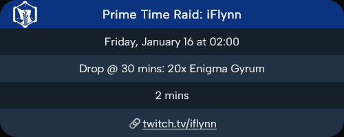 >https://www.twitch.tv/iflynnPrime Time raid live in 2mDrop:1. 30m - 20x Enigma Gyrum