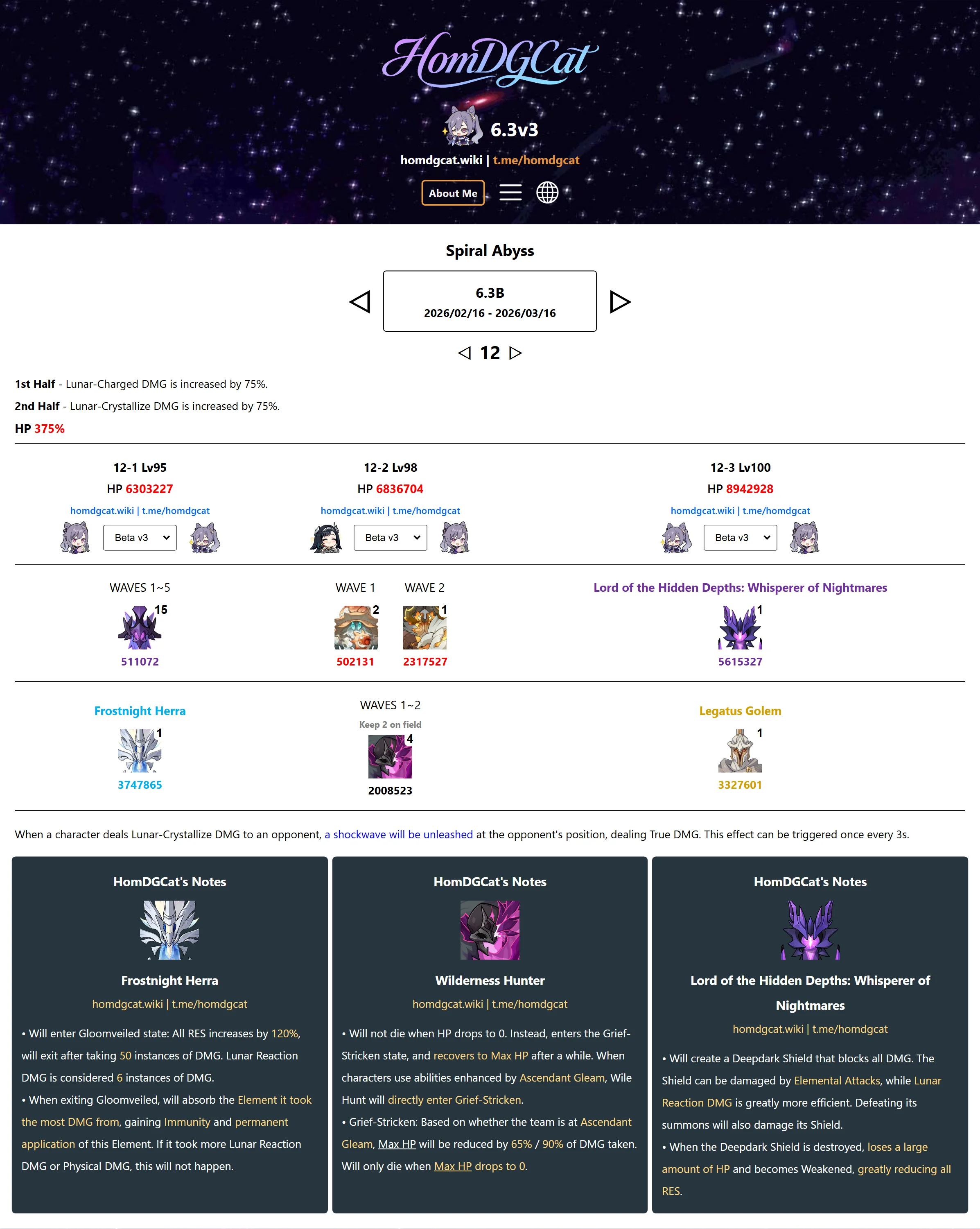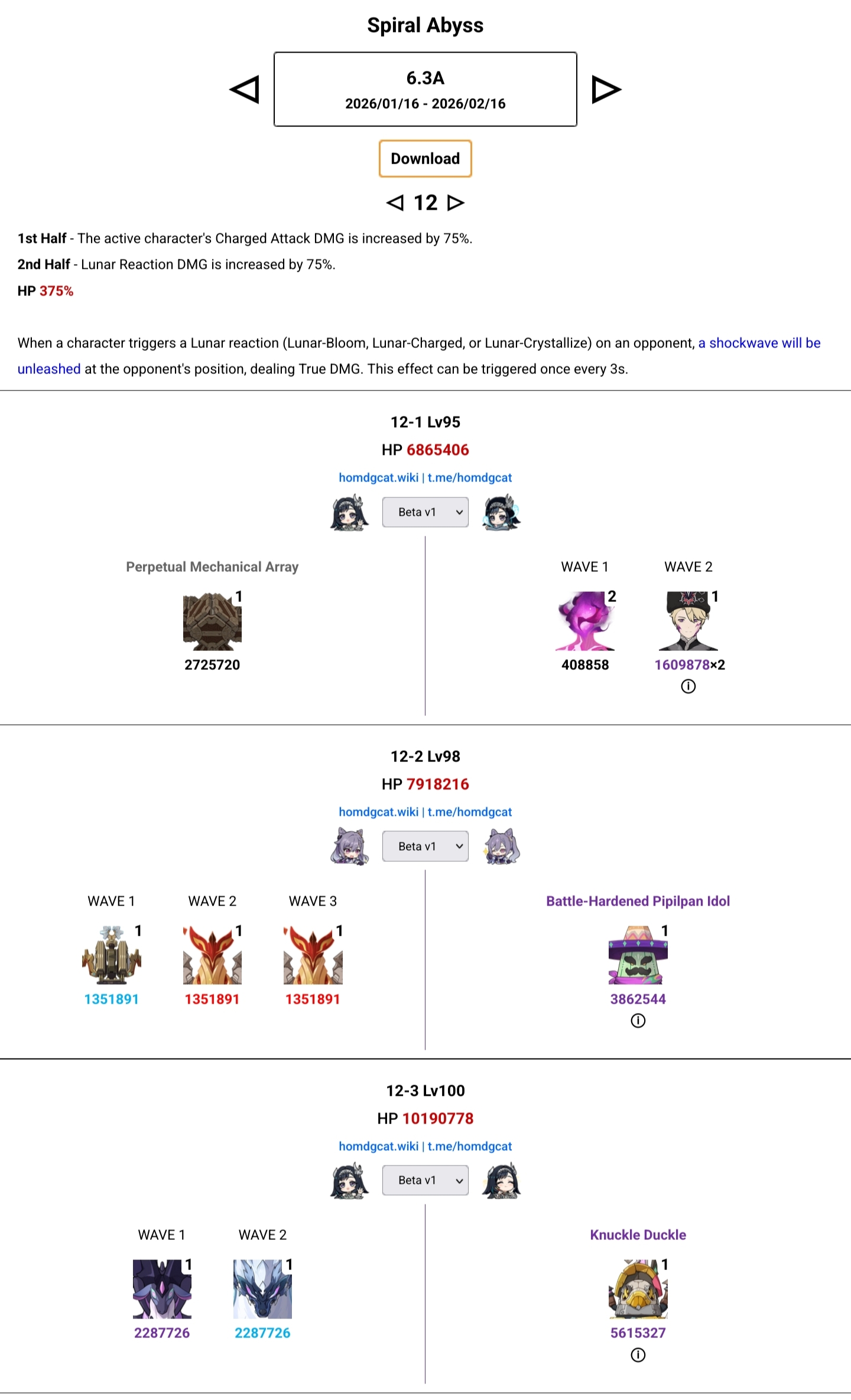 >Too shy to post or just wanted to make sure I get your clear?>Can't solve captcha to post?Send them to me privately here:https://form.jotform.com/253493679126468---------Luna III 2025-12-16 Spiral Abyss StatisticsSample size: 152 (4/gig/, 8/gig/ and /gigvmg/)Finalized: 2026-01-15Character Usage (List view): https://files.catbox.moe/rn0psw.pngOther Statistics: https://files.catbox.moe/a27h5z.png---------Congratulations to these anons for being:"4/gig/'s Top 10 SOVLFVL clears of Spiral Abyss 2025-12-16 Luna II"#1. Clear #75 - >550449459 - 976 points#2. Clear #48 - >550392347 - 905 points#3. Clear #86 - >550486929 - 903 points#4. Clear #65 - >550421054 - 883 points#5. Clear #135 - >550738850 - 878 points#6. Clear #76 - 874 points: https://files.catbox.moe/170431.png (jotform submission)#7. Clear #139 - >550849719 - 873 points#8. Clear #87 - >550487728 - 859 points#9. Clear #92 - >550501765 - 857 points#10. Clear #150 - >553791093 - 852 pointsLeaderboard: https://files.catbox.moe/3bv08u.png---------How is the ranking tabulated?Every submissions get 1000 points as default grade,then the grade will be reduced based on voting data of this poll(Vote if you haven't/ Change your vote: https://strawpoll.com/B2ZB9wmqAgJ | Columbina & Zibai Options added)Submissions with similar grade will then be ranked by the order of submission time(earlier submission gets higher rank)---------Good luck on your next Spiral Abyss, anons!I'll be collecting your clears when it resets. Feel free to post them here.