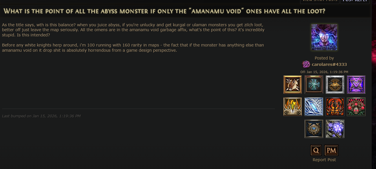 >>554106582>Actually, this got me thinking with how the game even progresses after maps.>>Get told to do some atlas shit with Kirac>>Progress up>>Buy some stuff off Kirac if you can read that he has some>>Could probably go up to T16s just doing this>>Also meet Eater and Exarch and probably do that too>>Probably see some new weird maps where the boss drops something that you can seemingly assemble>>Do that and get void stones>>Maven probably gets finished as well if you bothered doing her stuff>It's near impossible to miss unless somehow you don't know how to properly trigger the Eldritch trio (didn't read) or do the stuff to get frags for UE (didn't read).