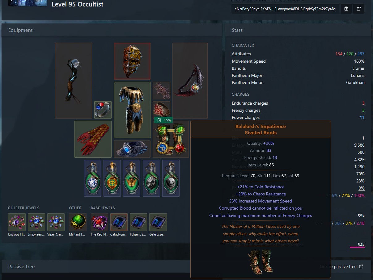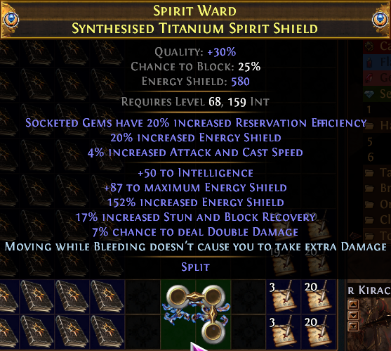 >>553941576To add on to >>553941012 you can also use Essentia Sanguis to convert all life leech to ES leech since you're CI and don't care about the actual life leech in the first place. This'll free up your belt slot and anoint at the cost of your glove slot which may or may not be a better setup for you.