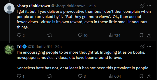 >>554094426I wonder if this makes someone seethe enough to make a video with the thumbnail>THIS FUCKING GOBLINOID IS A RETARD KEKand when anyone complains, they'll just be replied with "it was to inculcate intrigue and healthy lines of thought"