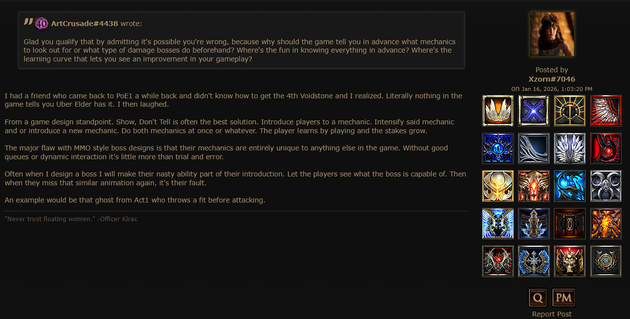 >>554104467Actually, this got me thinking with how the game even progresses after maps.>Get told to do some atlas shit with Kirac>Progress up>Buy some stuff off Kirac if you can read that he has some>Could probably go up to T16s just doing this>Also meet Eater and Exarch and probably do that too>Probably see some new weird maps where the boss drops something that you can seemingly assemble>Do that and get void stones>Maven probably gets finished as well if you bothered doing her stuffIt's near impossible to miss unless somehow you don't know how to properly trigger the Eldritch trio (didn't read) or do the stuff to get frags for UE (didn't read).