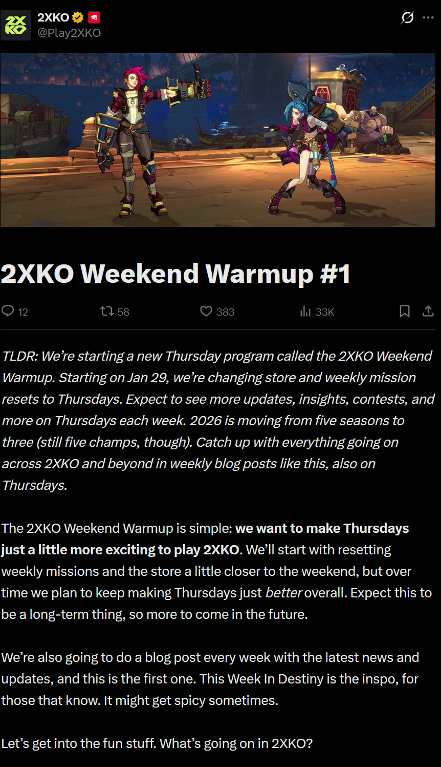https://x.com/Play2XKO/status/2011883600980164876>TLDR: We’re starting a new Thursday program called the 2XKO Weekend Warmup. Starting on Jan 29, we’re changing store and weekly mission resets to Thursdays. Expect to see more updates, insights, contests, and more on Thursdays each week. 2026 is moving from five seasons to three (still five champs, though). Catch up with everything going on across 2XKO and beyond in weekly blog posts like this, also on Thursdays.Uh oh. They're already scaling back on thingsWe might have another LoR on our hands...gg go next riot