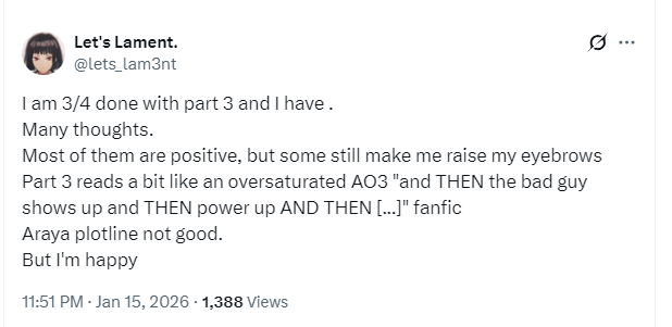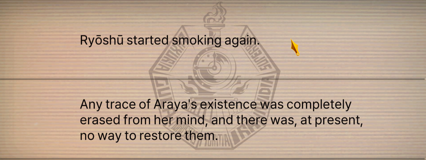 Finally finished the canto. I'd say it's okay. I have the same feeling I had with Canto 8. Overall is pretty good, had a lot of things and moments I really liked, but the final fight was meh. Canto 8 makes sense because the climax was meant to be part 2, but 9 is just kinda... Ehh. It was alright though. I'd give it a 7/10. I think my main grip is the fact that it's not really that clear how much Ryoshu actually remembers of Araya. Dante mentions at the end that she most likely doesn't remember anything, perchance just remembering that there's 'something' she's missing, but that's it. But then again her new EGO line directly mentions her.
