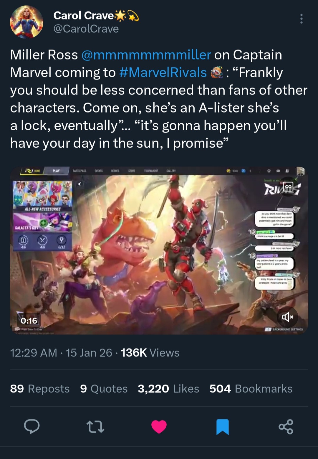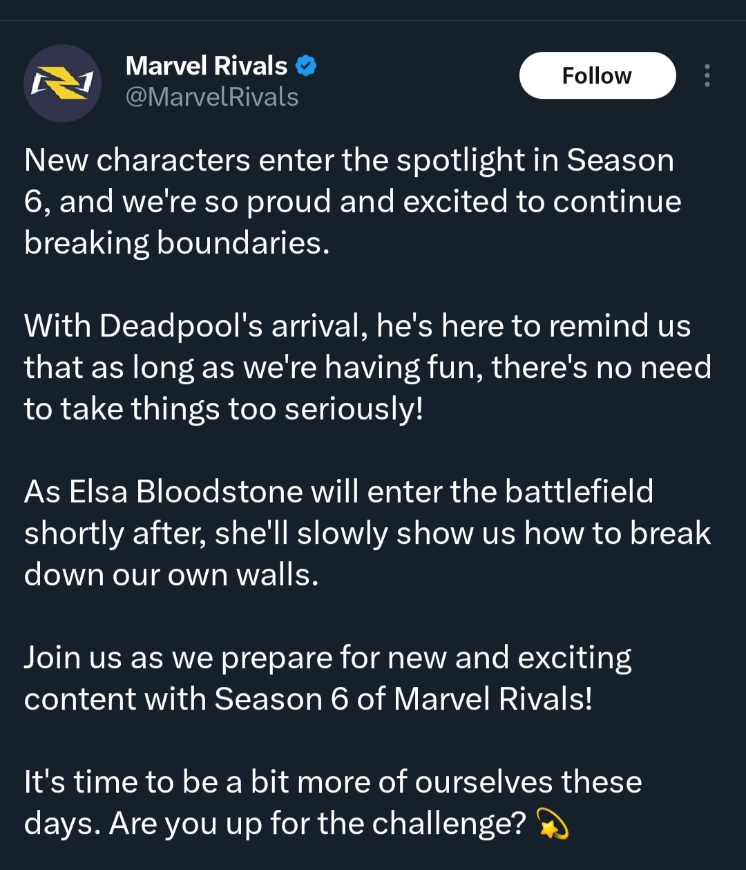 You have mere hours!! Edition>NewsSeason 6 patch notes: https://www.marvelrivals.com/balancepost/20260113/41667_1281488.htmlWhack-a-Jeff event & 8-bit bash skin: https://x.com/MarvelRivals/status/2011181460666126497Deadpool gameplay trailer: https://www.youtube.com/watch?v=6Y1sQPyhz5sDeadpool role (yes, he is playing all 3): https://x.com/mmmmmmmmiller/status/2011121137091006775Dev Vision Vol. 13: https://x.com/MarvelRivals/status/2011121065754239208Gone Nutty for Gifts Event Pass: https://x.com/i/status/2001321617889354199 Jeff's Winter Splash Festival: https://youtu.be/2DEpKcigA30Season 6: Night at the Museum Official Trailer: https://youtu.be/Aj53c2Uxrtc>StoreNew Venom MVP animation for 8-bit skin: https://x.com/i/status/2011486867837886894New Spider-Man MVP animation for 8-bit skin: https://x.com/i/status/2011501841775800816New accessories: https://www.youtube.com/shorts/QSQw4klZ8FUDeadpool captain skin: https://x.com/i/status/2011151261224292453Adam Warlock's Cosmic Warlock and Phoenix's Ice Phoenix skins: https://x.com/i/status/2008569384034291792Human Torch's Jack of Hearts skin: https://x.com/i/status/2006394923981898142 Loki's Lady Loki skin: https://x.com/i/status/2006032816249909267 Thor's God of Winter and Cloak & Dagger's Ice Pas de Deux skins: https://x.com/i/status/2003495853785219166 Star-Lord's Starcracker, Peni Parker's Snow-SP//dr, and Daredevil's Not Daredevil skins: https://x.com/i/status/2000974432089542971Rogue's Savage South and Rocket Raccoon's Rocket of the Rafters skins: https://x.com/i/status/1998475280659182007>LinksHero Hot List: https://marvelrivals.com/heroes_data/Guides & News: https://marvelrivals.gg/Tracker Resources: https://rivalstracker.comMobalytics Page: https://mobalytics.gg/marvel-rivalsFANDOM Wiki: https://marvelrivals.fandom.com/Previously on /mrg/: >>553934292