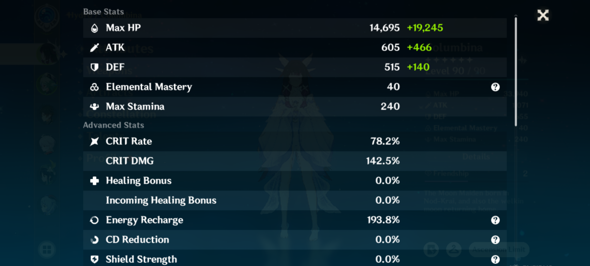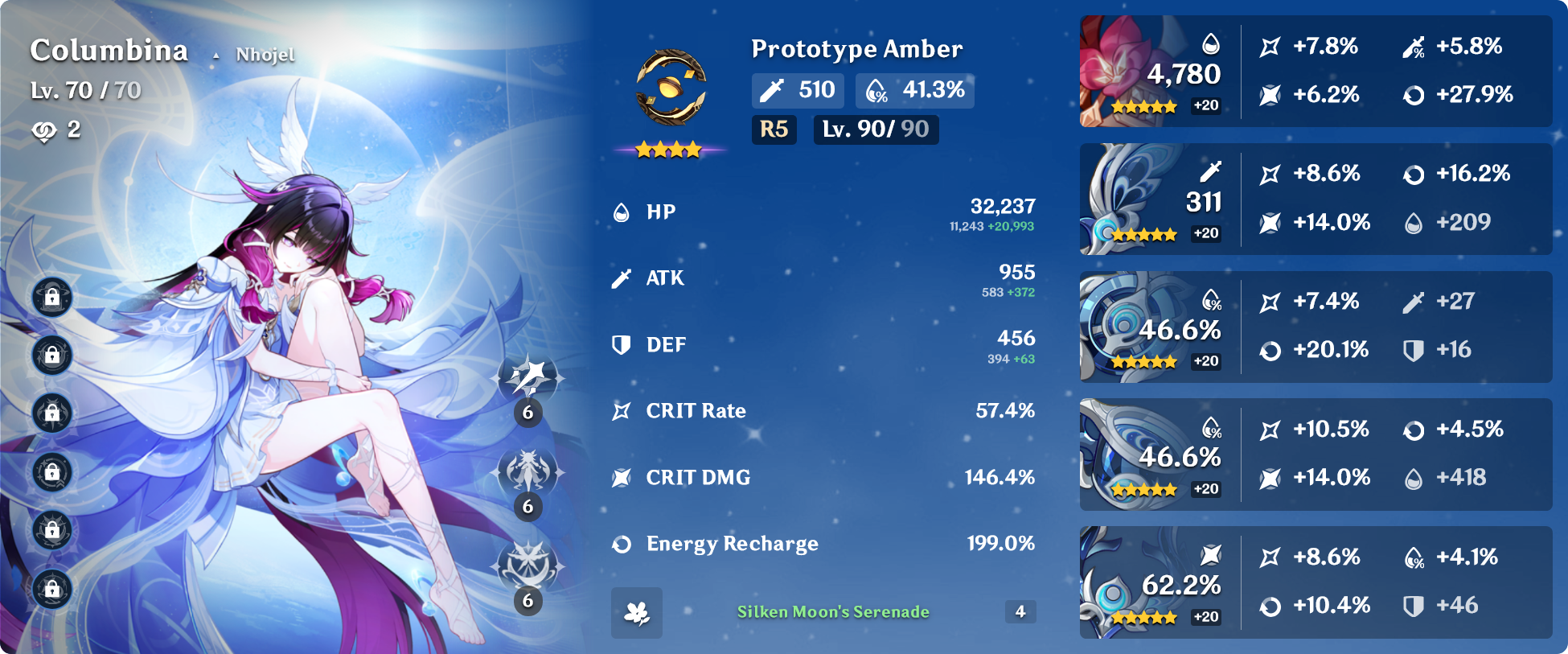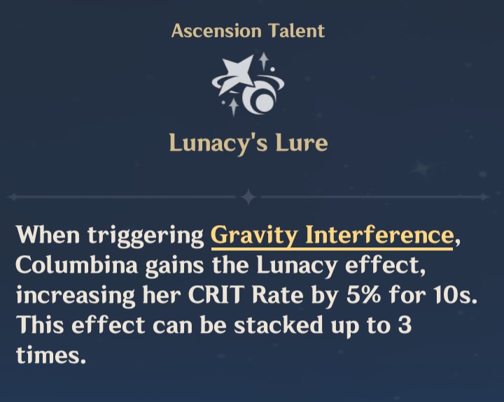 They updated her drip marketing"Huh? What kind of question is that? Of course, I don't like her. She spends her days bumming around and singing, drops in on tea parties whenever she feels like it, and has zero social graces. How has she survived this long anyway, prancing around being all nice and naive!? Hmph. If reality ever hits her hard, I'll be watching. Laughing. Don't count on me to step in."— From a conversation between Marionette and The Fair Lady at a tea party◆ Name: Columbina Hyposelenia◆ Title: Welkin Moon's Homecoming◆ The Returning Moon Goddess◆ Tri-Lunar Convergence: Hydro◆ Constellation: Columbina Hyposelenia