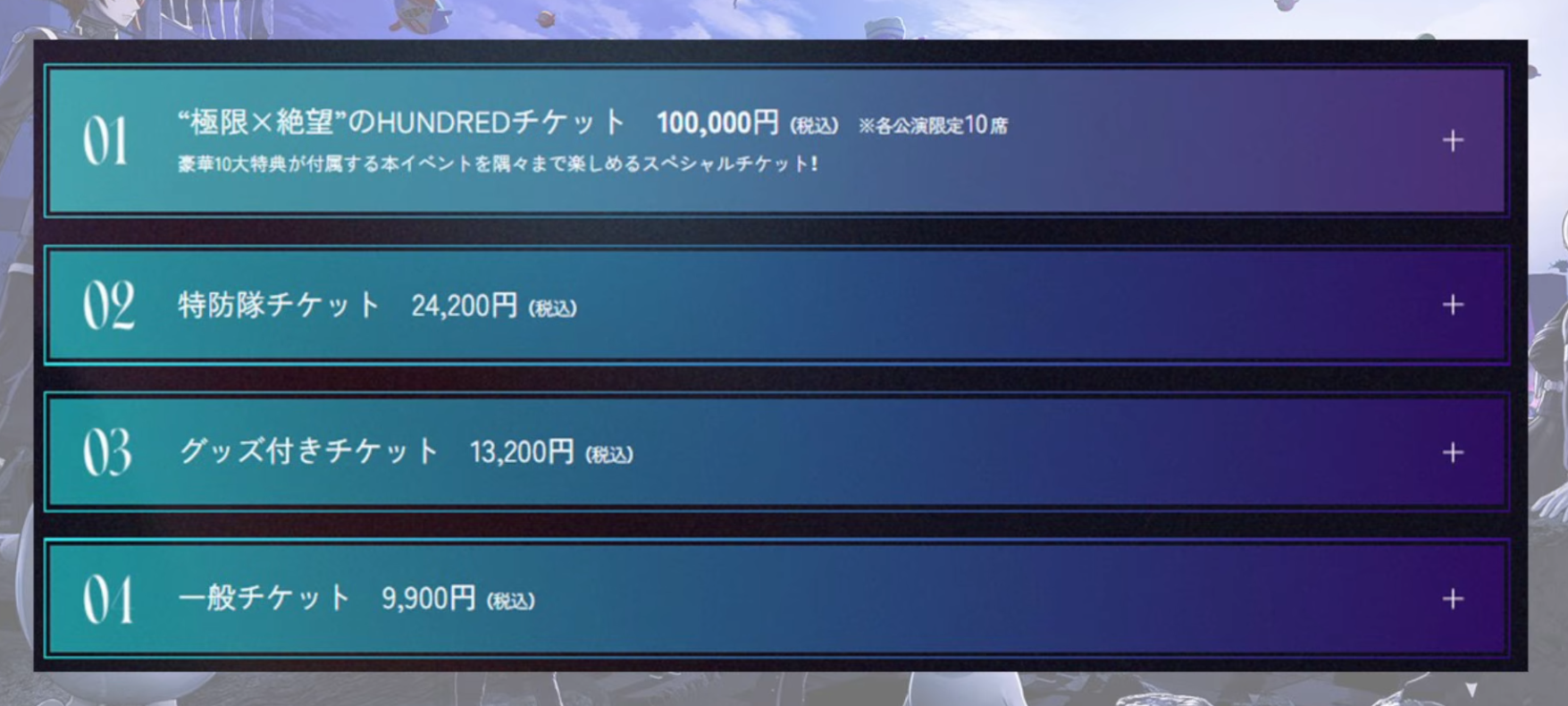"Extreme × Despair" HUNDRED Ticket: 100,000 Yen (Tax Included) Limited to 10 seats per performanceA special ticket that allows you to enjoy every corner of this event, including 10 magnificent bonuses!Bonuses Guaranteed front-row viewing ticket Choose from in-game illustrations! Your own personal Chara-Fine Graph with luxury framing (A3 Size) Autographed shikishi (signature board) signed directly by Tookyo Games creators (Kazutaka Kodaka, Kotaro Uchikoshi, Rui Komatsuzaki, Shimadoriru, Masafumi Takada) Group autographed shikishi signed directly by event cast members (Taihi Kimura, Takahiro Sakurai, Megumi Ogata, Rikako Ito) Meet & Greet + Photo Session with Director & Scenario Writer "Kazutaka Kodaka" Two-shot Cheki (Polaroid-style photo) + Autograph Session with cosplayer "Nene" wearing character costumes from "HUNDRED LINE -Last Defense Academy-" Invitation to the rehearsal held on the day of the event Cast members will not be present Specially designed admission pass 1st Anniversary Commemorative Newly Drawn Visual Fine Mat (A5 Size) Original newly written novel supervised by Kazutaka Kodaka: "SIF Prequel FILE 05: The Birth of Eito Aotsuki"