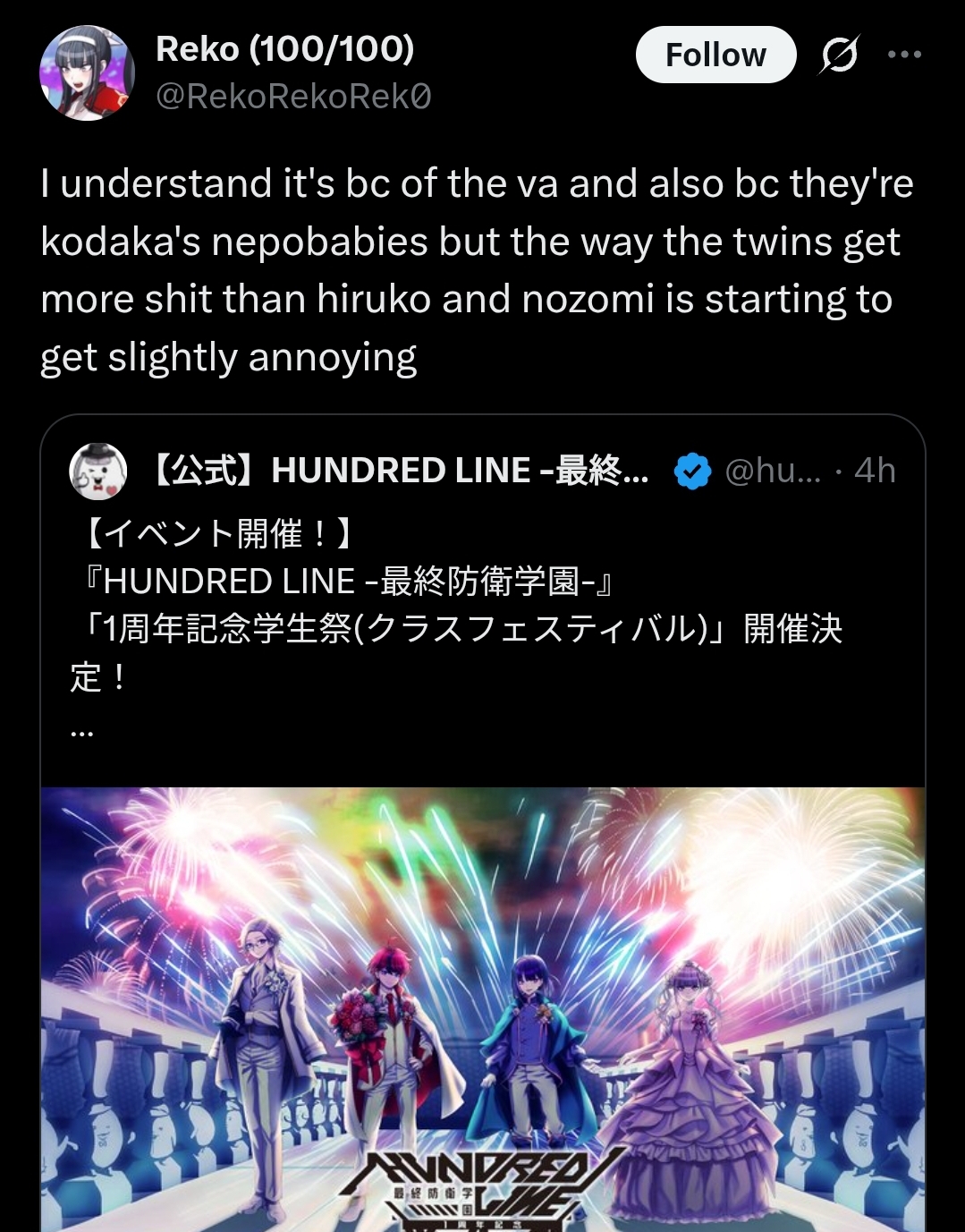 A general for the discussion of TooKyo Games' "The Hundred Line -Last Defense Academy-" Tactical RPG and adventure game written by Kazutaka Kodaka and Kotaro Uchikoshi.Previous thread:>>553660936NOTE: Don't forget that there's a stream today https://x.com/hundred_line/status/2012012587656101938 Buy the game and play:>Steamhttps://store.steampowered.com/app/3014080/The_Hundred_Line_Last_Defense_Academy/>Switchhttps://www.nintendo.com/us/store/products/the-hundred-line-last-defense-academy-switch/Game information:>Official websitehttps://hundred-line.com/en/>Flowchart/Route guide (No Spoilers)https://arch-img.b4k.dev/vg/1746873993910.png>Flowchart/Route guide (Spoilers)https://arch-img.b4k.dev/vg/1747005823544.pngGame resources:>Former Lives of the SDU: File 03 – Hiruko Shizuhara’s First Battle (Novel)https://docs.google.com/document/u/0/d/1wAGYS0WiNCIPvbXfFF0UyhGgDP4LK7aMhbupLBOoHok>Character sprites, CGs, Cut-ins, and other assetshttps://drive.google.com/drive/folders/1vc56NSu3o-WGDAaFGVVk9n7cHmvD32J->Artbook (Character design sheets)https://drive.google.com/drive/folders/1xFZvHYyabQUCRw-myEcYwRKIF4qfcD_T>Complete Soundtrack Albumhttps://mega.nz/file/uAo0FQrC#yA1IxguTxIWvGEM0-E3GrJ4Csqm6KLLI70n2fBirrKALatest:>End of the creator's blog, Vol.14https://hundred-line.com/special/blog/detail/?p=14>Kodaka's weibo Q&A compilationhttps://docs.qq.com/sheet/DV2ZWRHFobVdrcWJ2>Kodaka's Interview with Bloomberghttps://www.bloomberg.com/news/newsletters/2025-07-11/-the-hundred-line-last-defense-academy-nearly-bankrupted-too-kyo-games>Kodaka is currently making the Darumi prequel novel>Dengeki Online Popularity Poll results:https://dengekionline.com/article/202510/51018>Kodaka's interview with DekuDealshttps://www.dekudeals.com/articles/kazutaka-kodaka-hundred-line-last-defense-academy-interview>Hundred Line 2 is Announced and Trailer Dropshttps://www.youtube.com/watch?v=WuXyGP7pO88