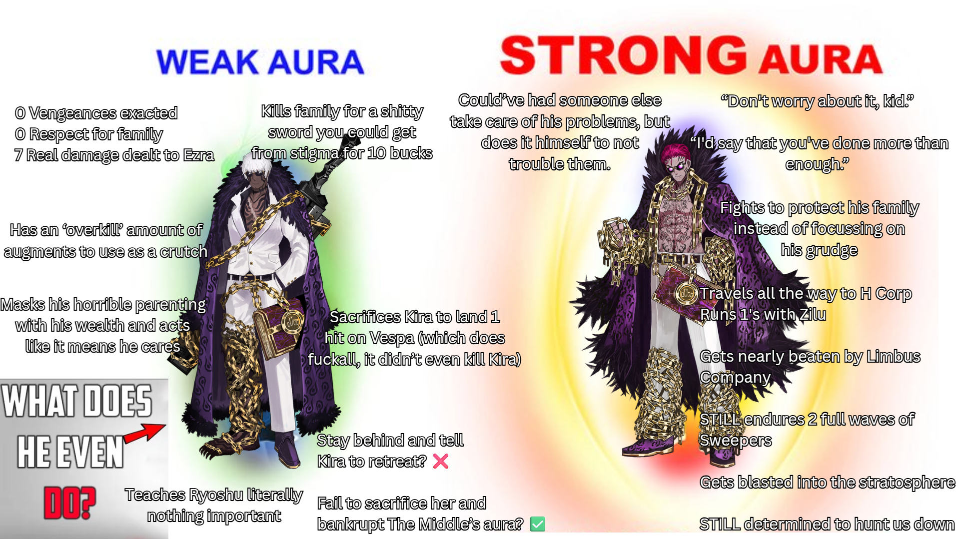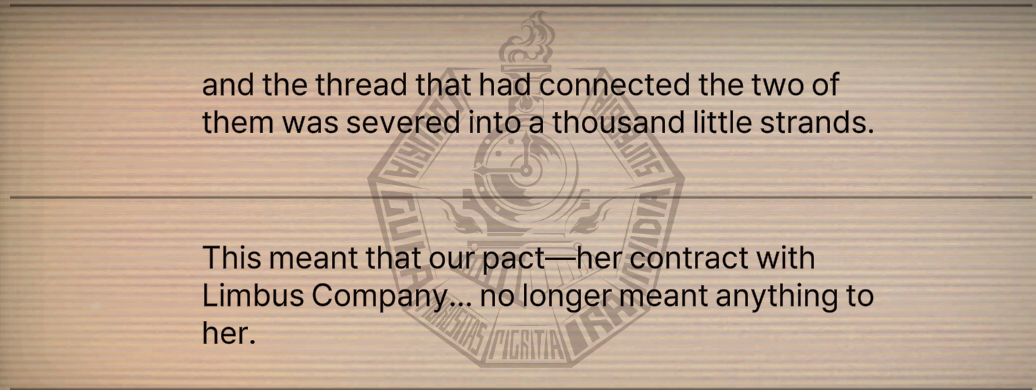 Man this entire universe feels like it's going down the gutter.You have a whole thing about light, the disease of the mind, abnos and then egos, ruina added distortions to the Mix which is fine reallyAnd now almost everything else is building up to outshine this aspect>abnos used to dangerous abominations which are related to the light etc, now relegated to monster of the current season and who knows how or why they matter anymore>special time-dilating blood which may as well make rank it above or below abnos/ego/singularity?>more concept incinerator shenanigansEven egos feels like they've got hit in this canto because 2nd rate or even 3rd rate.>6+ scripted fights in a row where you became the clerks you so utterly despise>random roland wanking even to the point of reusing his bad end and even the same backgroundLike what the fuck? It makes the H Corp incident looks like nothing. It makes every almost every past characters from both LobCorp and Ruina looks incompetent and inconsequential and makes you wonder how some of them were even considered threats