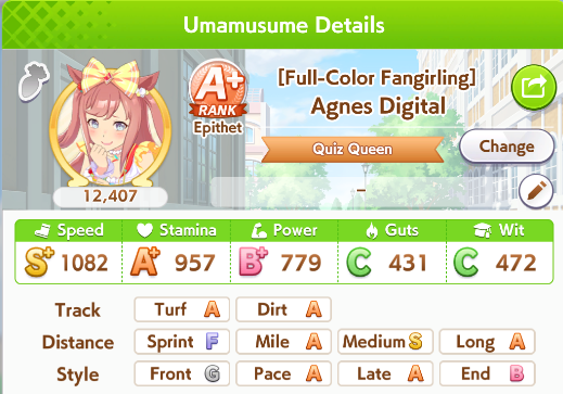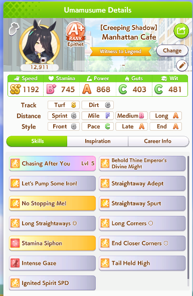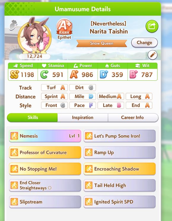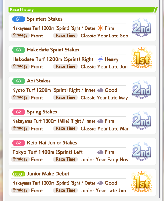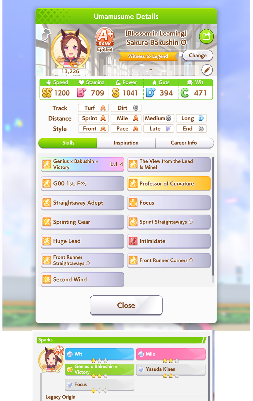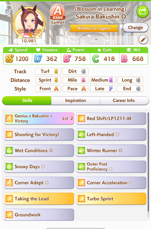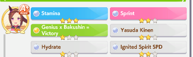 I'm done with bakushin, this'll have to do she never gets distance or turf on good runs and gets a fucking mood down/sleep deprived every other turn