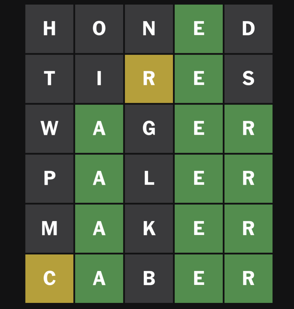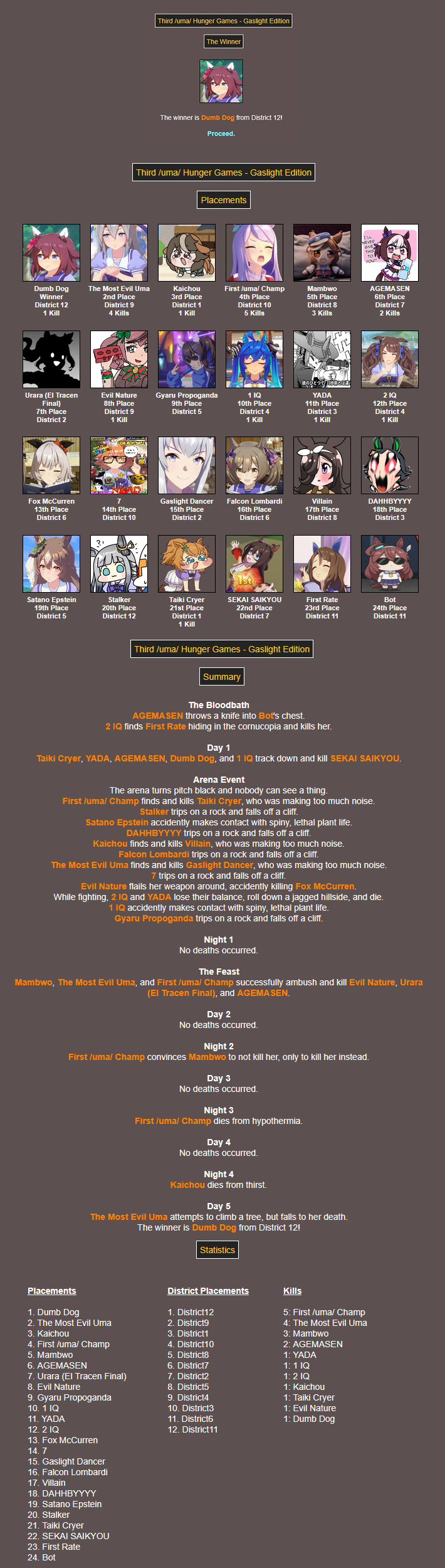 Summary results from the hunger games. The first champ got quite a lot of kills but she couldn't keep it up until the end.
