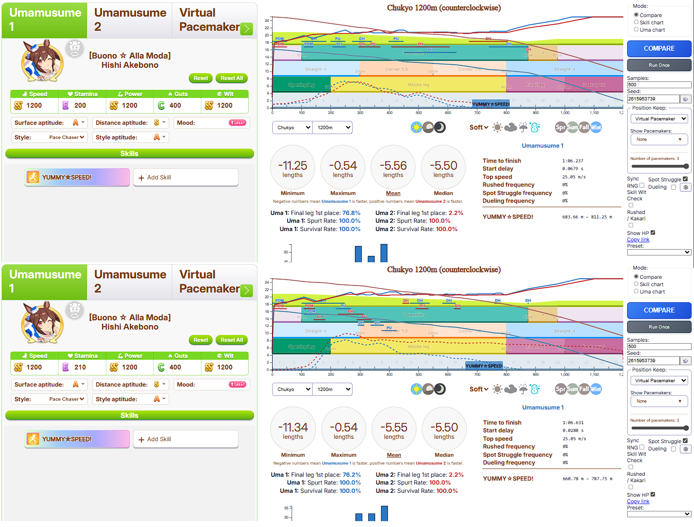 >>554020587The 10 stam didn't actually have much effect, and out of the 500 samples he ran for each uma, on exactly the final run the 200 stam happened to get a bit of accel and the one on 210 stam didn't. In reality, they both have roughly the same chance of hitting it and the main deciding factor are the highly volatile downhill wit rolls affecting your HP since almost the entire course is downhill.