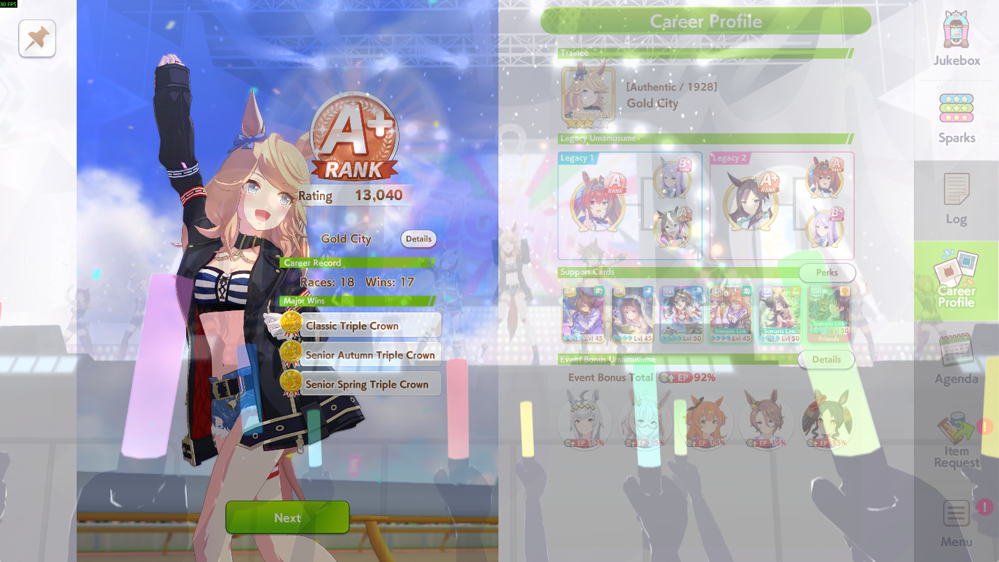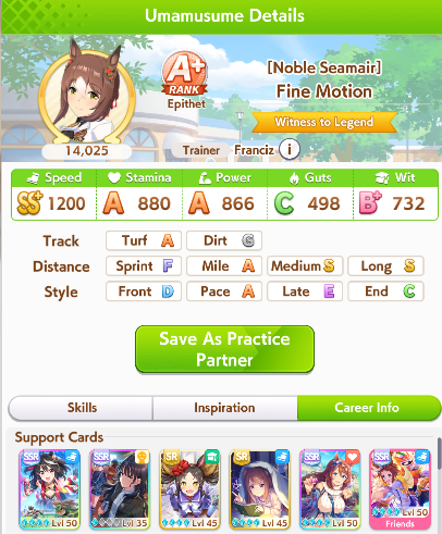 >>554020070You need like random 2 gold skills and a couple stats above 800 and then clear the career and you'll get an A.