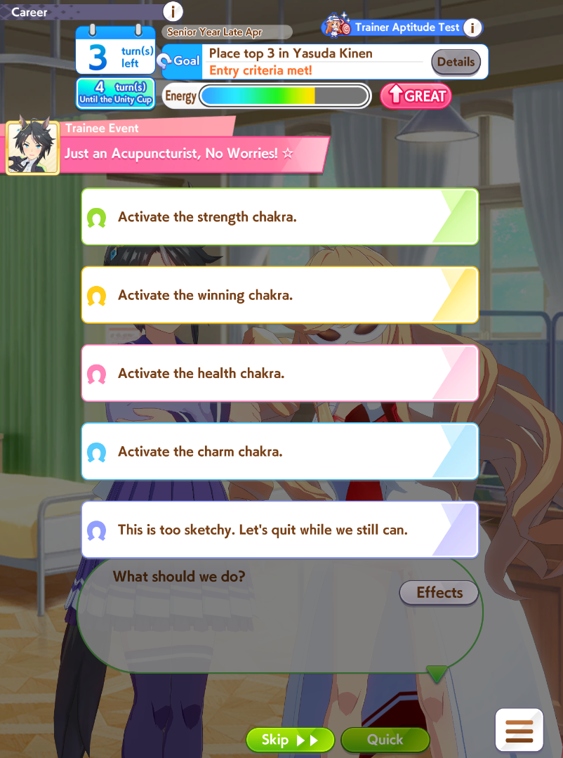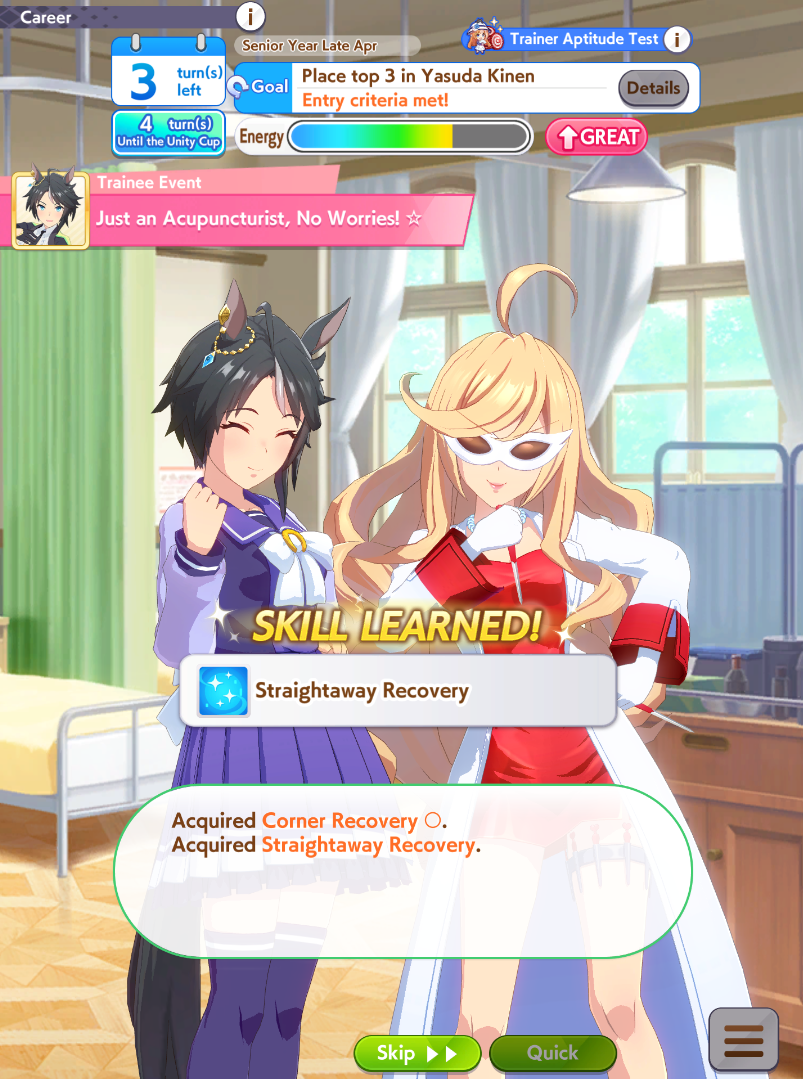 >>554020070do a career.build the skills and stats it tells you to to get extra points https://gametora.com/umamusume/events/trainer-exam