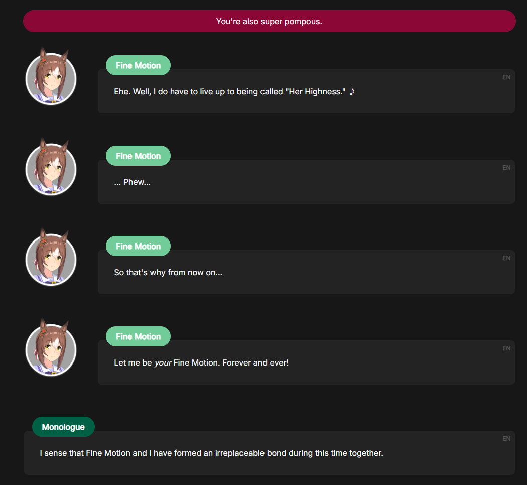 >Bot so you can discuss things other than the game on /uma/ all dayDo you guys actually just want friends to hang out with?