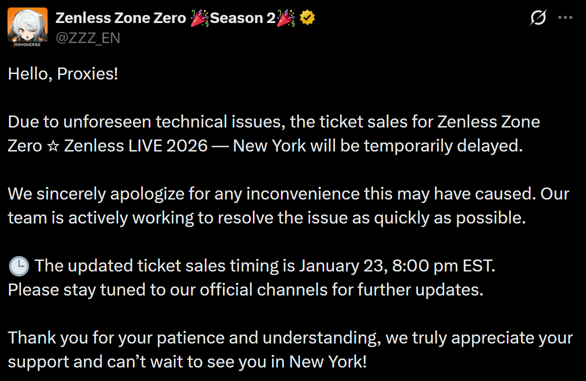 >Due to unforeseen technical issues, the ticket sales for Zenless Zone Zero Zenless LIVE 2026 — New York will be temporarily delayed.> The updated ticket sales timing is January 23, 8:00 pm EST. https://x.com/ZZZ_EN/status/2011758302292590705