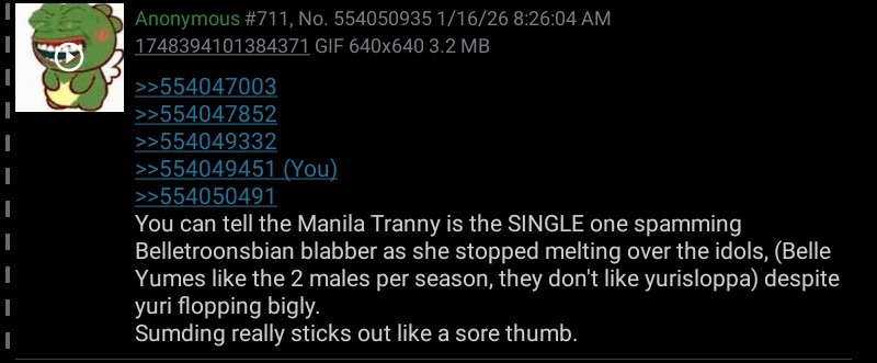>>554047003>>554047852>>554049332>>554049451>>554050491You can tell the Manila Tranny is the SINGLE one spamming Belletroonsbian blabber as she stopped melting over the idols, (Belle Yumes like the 2 males per season, they don't like yurisloppa) despite yuri flopping bigly. Sumding really sticks out like a sore thumb.