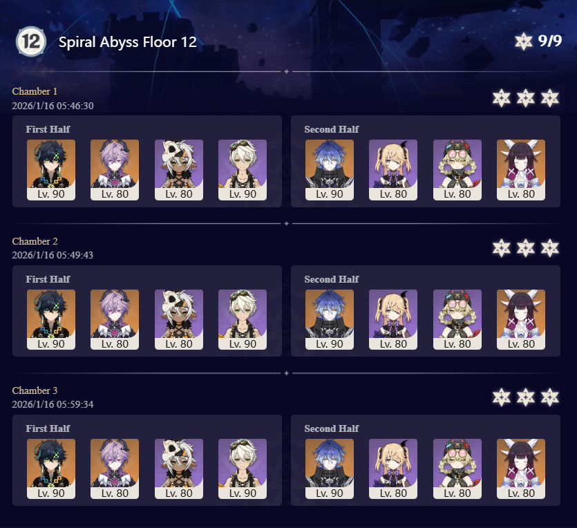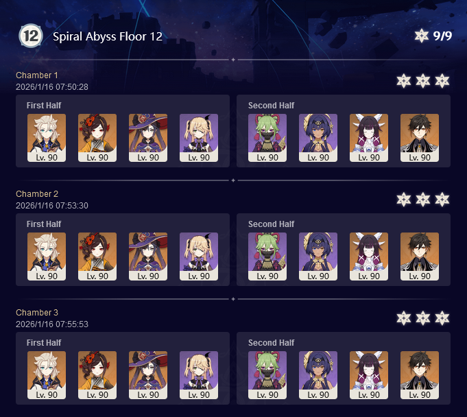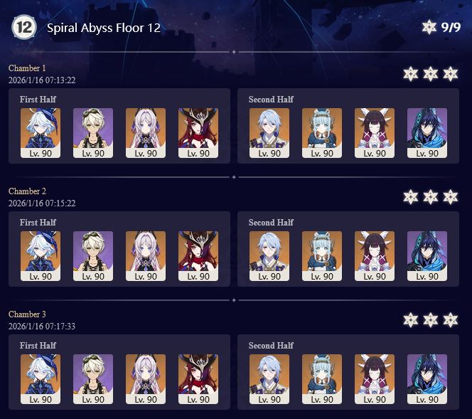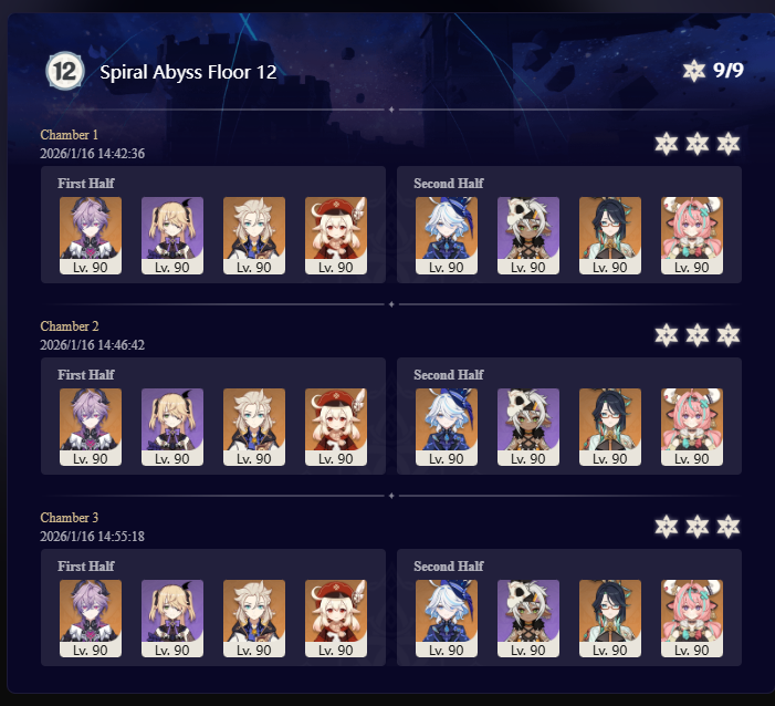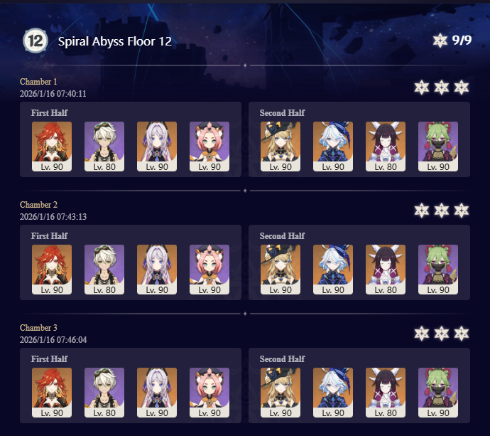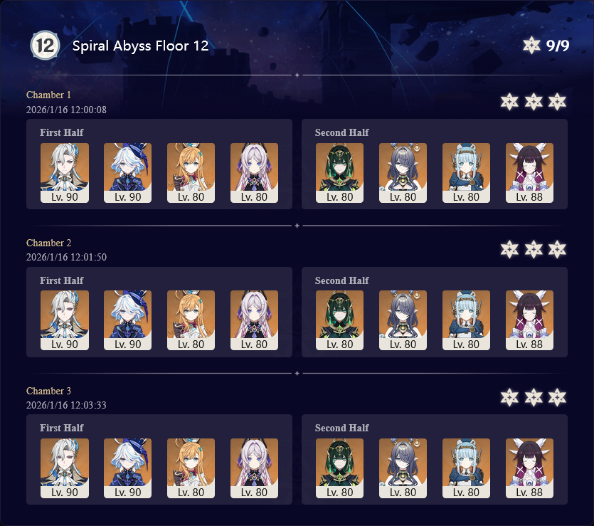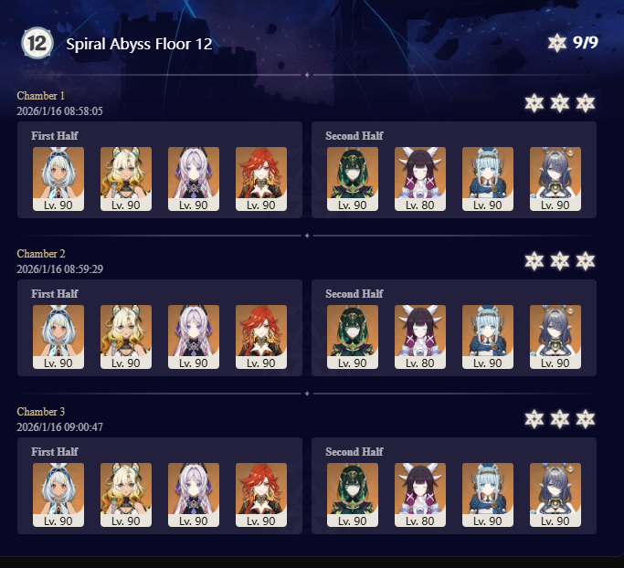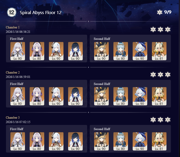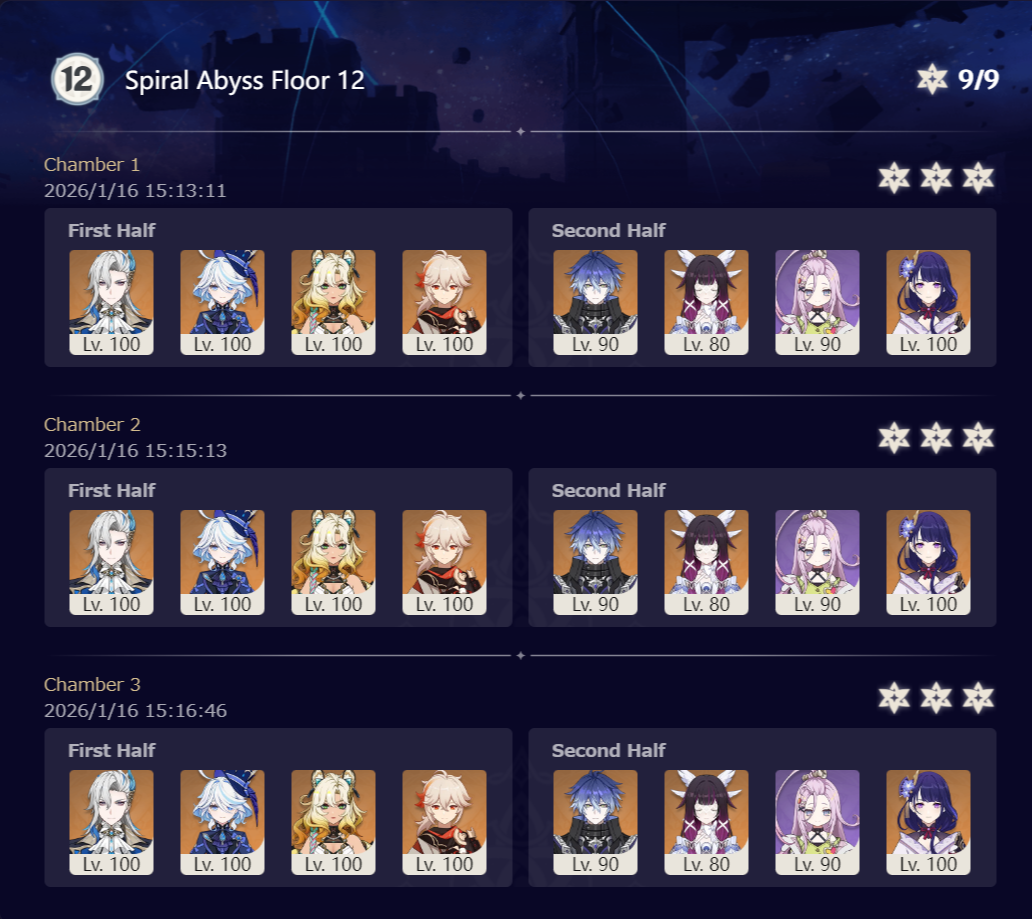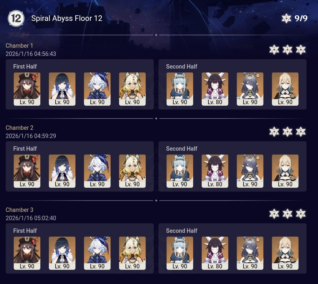 >Too shy to post or just wanted to make sure I get your clear?>Can't solve captcha to post?Send them to me privately here:https://form.jotform.com/253493679126468---------Luna III 2025-12-16 Spiral Abyss StatisticsSample size: 152 (4/gig/, 8/gig/ and /gigvmg/)Finalized: 2026-01-15Character Usage (List view): https://files.catbox.moe/rn0psw.pngOther Statistics: https://files.catbox.moe/a27h5z.png---------Congratulations to these anons for being:"4/gig/'s Top 10 SOVLFVL clears of Spiral Abyss 2025-12-16 Luna II"#1. Clear #75 - >550449459 - 976 points#2. Clear #48 - >550392347 - 905 points#3. Clear #86 - >550486929 - 903 points#4. Clear #65 - >550421054 - 883 points#5. Clear #135 - >550738850 - 878 points#6. Clear #76 - 874 points: https://files.catbox.moe/170431.png (jotform submission)#7. Clear #139 - >550849719 - 873 points#8. Clear #87 - >550487728 - 859 points#9. Clear #92 - >550501765 - 857 points#10. Clear #150 - >553791093 - 852 pointsLeaderboard: https://files.catbox.moe/3bv08u.png---------How is the ranking tabulated?Every submissions get 1000 points as default grade,then the grade will be reduced based on voting data of this poll(Vote if you haven't/ Change your vote: https://strawpoll.com/B2ZB9wmqAgJ | Columbina & Zibai Options added)>Check if you can edit your votesSubmissions with similar grade will then be ranked by the order of submission time(earlier submission gets higher rank)---------Good luck on your next Spiral Abyss, anons!I'll be collecting your clears when it resets. Feel free to post them here.
