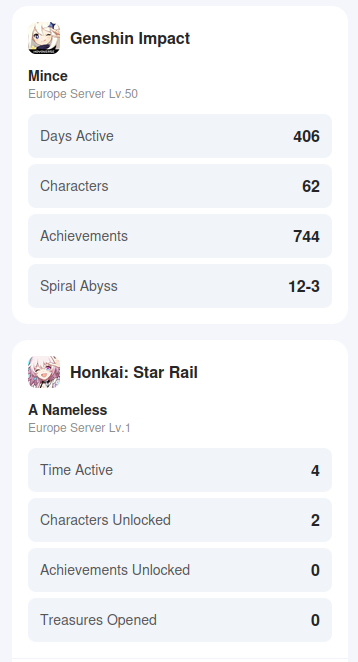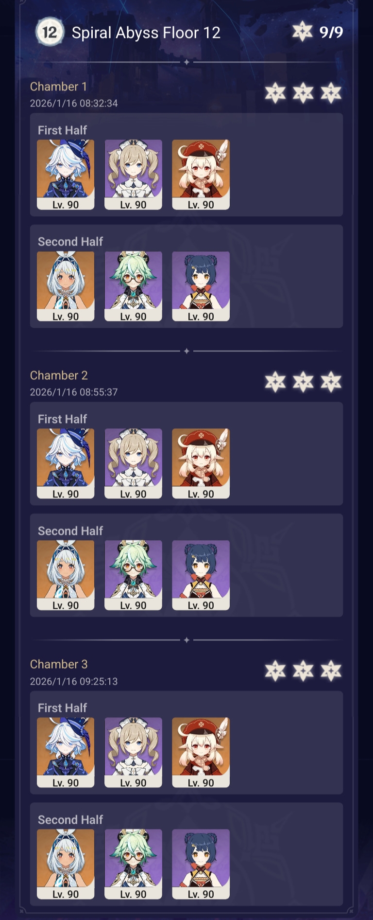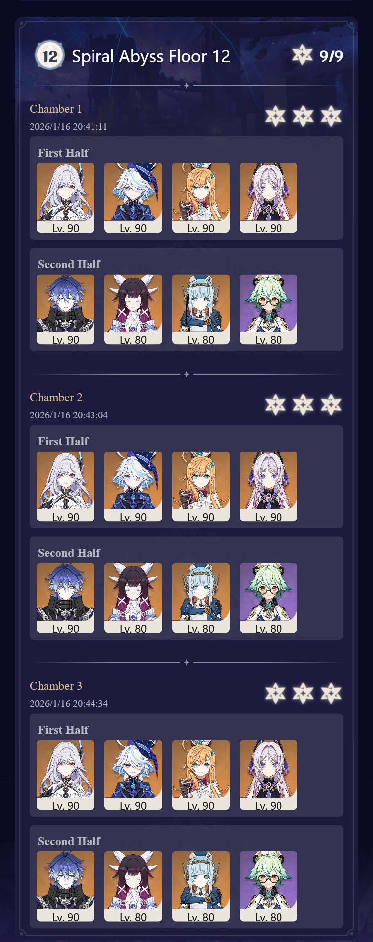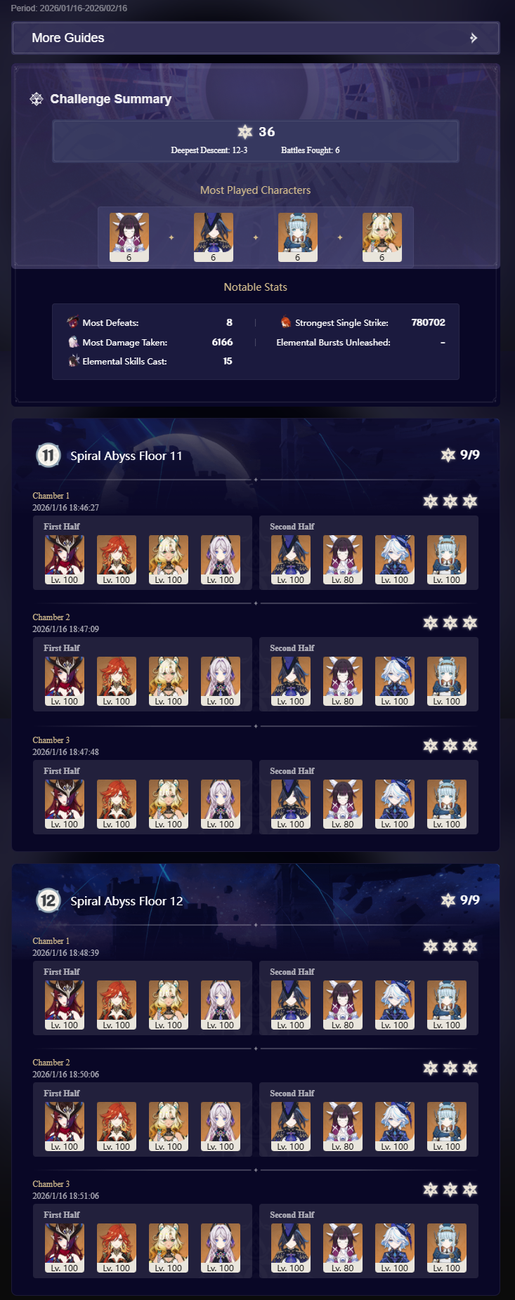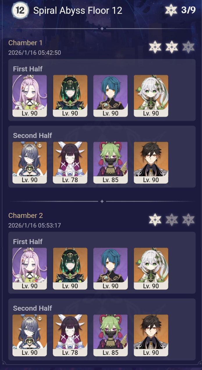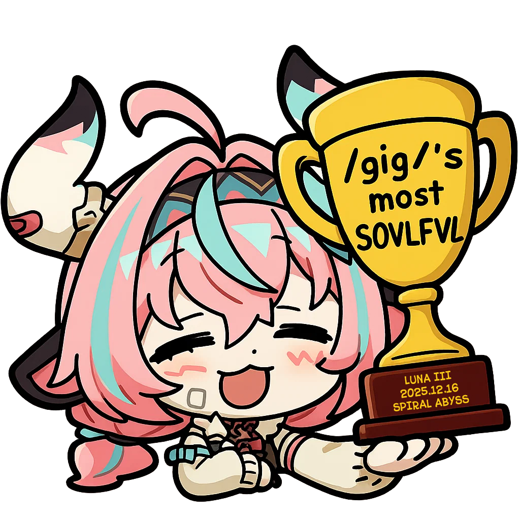 >Too shy to post or just wanted to make sure I get your clear?>Can't solve captcha to post?Send them to me privately here:https://form.jotform.com/253493679126468---------Luna III 2025-12-16 Spiral Abyss StatisticsSample size: 152 (4/gig/, 8/gig/ and /gigvmg/)Finalized: 2026-01-15Character Usage (List view): https://files.catbox.moe/rn0psw.pngOther Statistics: https://files.catbox.moe/a27h5z.png---------Congratulations to these anons for being:"4/gig/'s Top 10 SOVLFVL clears of Spiral Abyss 2025-12-16 Luna II"#1. Clear #75 - >550449459 - 976 points#2. Clear #48 - >550392347 - 905 points#3. Clear #86 - >550486929 - 903 points#4. Clear #65 - >550421054 - 883 points#5. Clear #135 - >550738850 - 878 points#6. Clear #76 - 874 points: https://files.catbox.moe/170431.png (jotform submission)#7. Clear #139 - >550849719 - 873 points#8. Clear #87 - >550487728 - 859 points#9. Clear #92 - >550501765 - 857 points#10. Clear #150 - >553791093 - 852 pointsLeaderboard: https://files.catbox.moe/3bv08u.png---------How is the ranking tabulated?Every submissions get 1000 points as default grade,then the grade will be reduced based on voting data of this poll(Vote if you haven't/ Change your vote: https://strawpoll.com/B2ZB9wmqAgJ | Columbina & Zibai Options added)>Check if you can edit your votesSubmissions with similar grade will then be ranked by the order of submission time(earlier submission gets higher rank)---------Good luck on your next Spiral Abyss, anons!I'll be collecting your clears when it resets. Feel free to post them here.