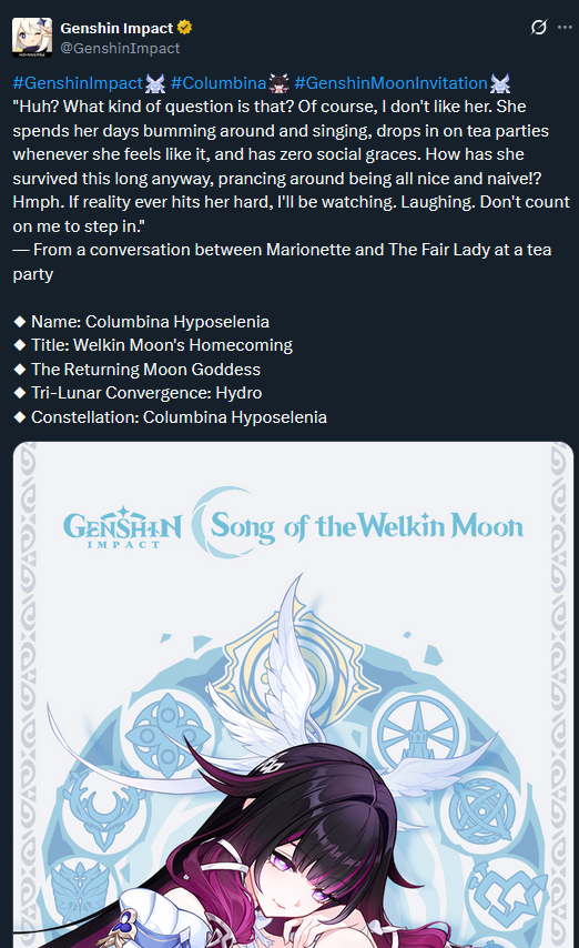 Previous: >>554021341 >Character Trailer - "Columbina: To Where She Flies"https://youtu.be/WsYsNoNjbaw (EN)https://youtu.be/9AVYsSZ1huA (JP) >Character Teaser - "Columbina: Where She Dwells"https://youtu.be/ME4OGvcPBUs (EN)https://youtu.be/7zLvIrPBGF4 (JP) >Version "Luna IV" "A Traveler on a Winter's Night" Trailerhttps://youtu.be/_yuHIzPJGHA (EN)https://youtu.be/wTL5hRtmWjM (JP) >Outfit Teaser: Teyvat Style – Nocturne of Serenityhttps://youtu.be/Q5I3xKJfIO4 (EN)https://youtu.be/TGsTYPeOtxw (JP) >Current character banner: Columbina, Ineffa, Ifa, Sethos, Fischl>Current weapon banner: Nocturne's Curtain Call (Catalyst), Fractured Halo (Polearm)https://www.hoyolab.com/article/43195155 >Daily check-in rewards (permanent)https://webstatic-sea.mihoyo.com/ys/event/signin-sea/index.html?act_id=e202102251931481&lang=en-us >Redeemable Codes with Primogems (all regions): https://genshin.mihoyo.com/en/giftGENSHINGIFT8X73KH58KDHNMoonInvitationLunaIV (NEW)P3GXX56W3VG9 >Useful Links (Wiki, Simulators, Maps, Character Builds, /gig/ friendlist, Third-Party Tools, etc.)https://rentry.org/giglinks /gig/ OP pastebin (use this if making new thread):https://pastebin.com/ca0zseQ9