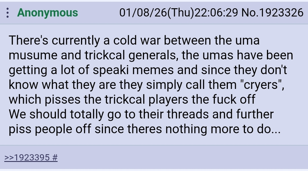>>554051742because apparently it workedd so they latch onto itThe only one that survived was uma because it was so blindingly fast shitposters couldn't even get their say in