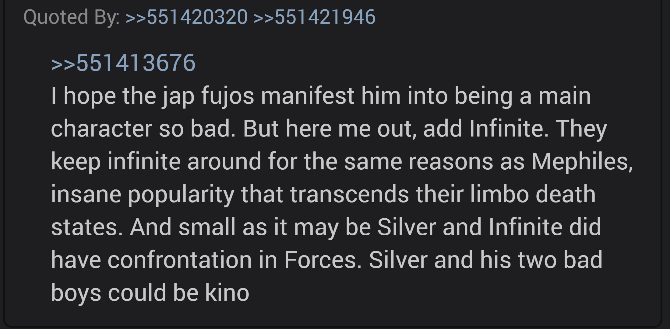 >>554139084>Infinite to be goodHologram>Infinite still alive?HologramMephiles? ID fucking K. He's basically Satan.