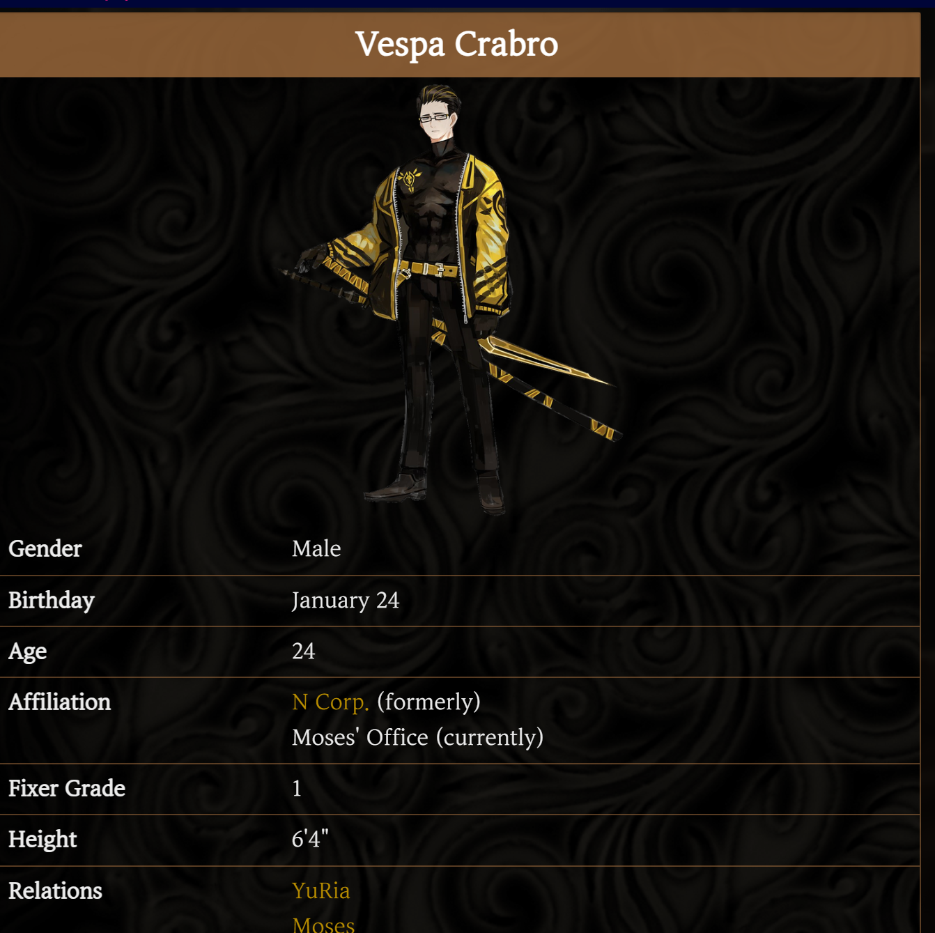 >>554091562>What was Ryoshu, Arayas, and the Pinky nursefather actual relationship?Shiomi's relationship to Ryoshu is unknown, but they are actually for real related. Ryoshu and Araya are thus related because Araya is a partial clone of Shiomi.>Speaking of time sense, that explains how Araya grew up too fast in the safe, but she's not actually shifting through the various ages at the end when shes talking to Dante, right?As far as we know? Yes she is. She shifts between Pinky Nursefather and Suit Mode physically, there's no reason she couldn't swap to the others.>Do you think we'll get a Certain Sinclair ID?Almost certainly not for a while, if at all.>Was the random base EGOs being usedNot a question.>Was there any followup to why the index wanted Rien to emulated Roland so much?Hermes thought it was funny. No, but seriously, the whole idea was to mold him into the perfect 'false father' for Ryoshu, given what information we have, Why that took the form of Roland we have no idea.
