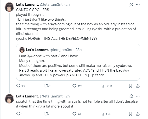 >>554101221I'm waiting for when those big ass polls with Canto ratings on social media are done to see what that relation could be. It might be a zone thing since, and lord forgive me for saying the name, I recall a xitter poll where like 5k-6k nips voted and Canto 7 was voted the best by a fucking country mile, but they like that kind of stuff about Don. Maybe they'll like C9 more and whoever you talked to liked it less, I imagine C6 is more liked in the west, C4 in Korea, C8 in China, etc.