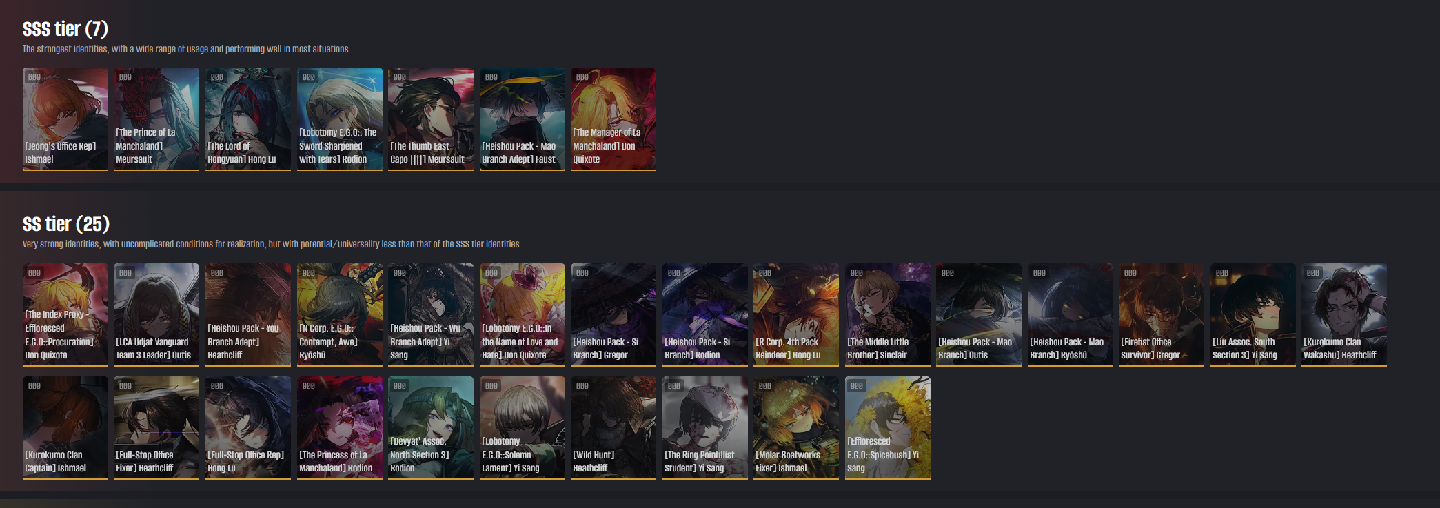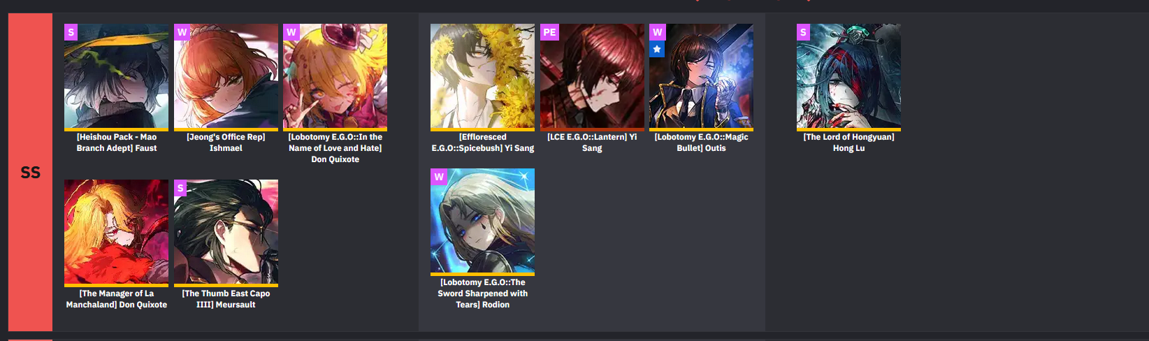 Sinners with EIM boss theme >Don quixote>Ryoshu>Heathcliff>Sinclair>Gregor