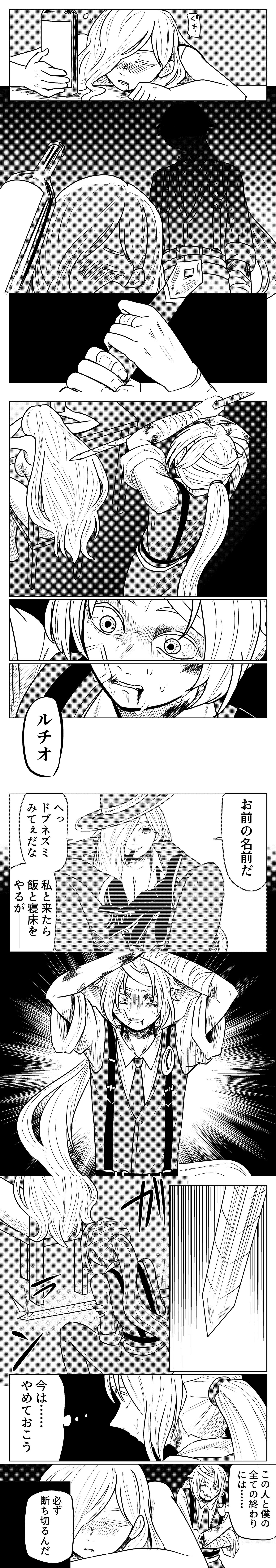 I took a glance at this with MTL, and what I could understand is>Lucio>That's gonna be your name>Instead of remaining a gutter rat, come with me and I'll give you a place to sleep and food>...Let's stop this for now.>At the end of the road, for me and that woman.>I'll server it myself?Or something like that. If anyone knows JP to give an accurate TL I'd typeset it after.