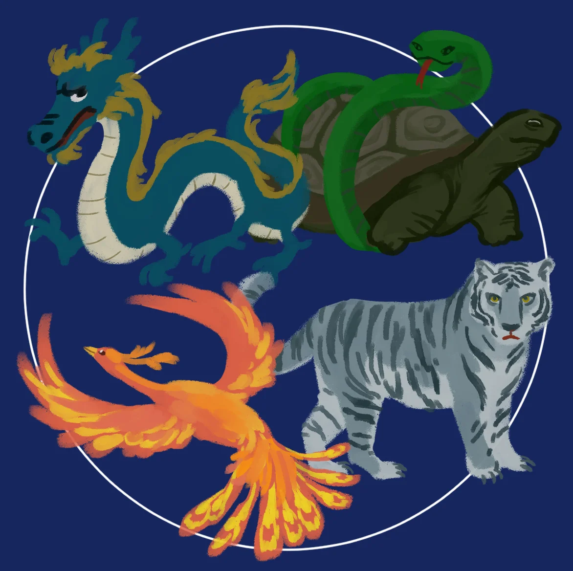>>554131747ah yes the four crooked symbols. the azure dragon of the north-west, the vermillion bird of the south-west, the white tiger of the south-east and the black turtle-snake of the north east