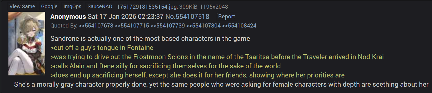>>554157116>sandrone is the best written fatuus>r/gay_HQ seethes about her just because she's female and they want their sexyman dottore back