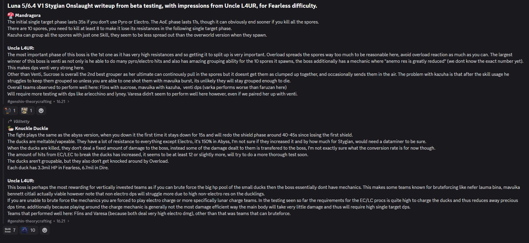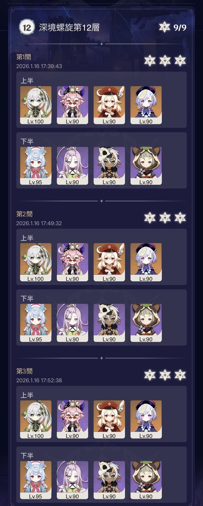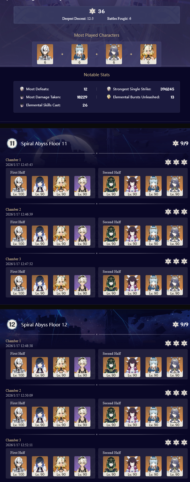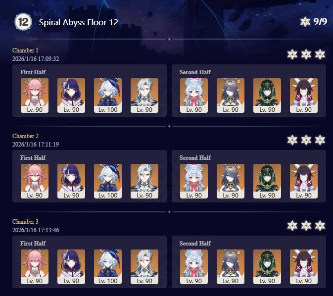 >Too shy to post or just wanted to make sure I get your clear?>Can't solve captcha to post?Send them to me privately here:https://form.jotform.com/253493679126468---------Luna IV 2026-01-16 Spiral Abyss StatisticsSample size: 154 (4/gig/, 8/gig/ and /gigvmg/)Finalized (draft): 2026-01-17Character Usage (List view):https://files.catbox.moe/lqtyc0.pngOther Statistics:https://files.catbox.moe/m6ddun.png---------Congratulations to these anons for being:"4/gig/'s Top 10 SOVLFVL clears of Spiral Abyss 2026-01-16 Luna IV"#1. Clear #31 - >>554034203 - 917 points#2. Clear #58 - >>554049071 - 916 points#3. Clear #80 - >>554067965 - 914 points#4. Clear #38 - >>554038504 - 908 points#5. Clear #118 - >>554095160 - 902 points#6. Clear #106 - >>554082418 - 897 points#7. Clear #71 - >>554059003 - 891 points#8. Clear #76 - >>554062932 - 885 points#9. Clear #109 - >>554086232 - 872 points#10. Clear #111 - >>554087760 - 868 pointsLeaderboard: https://files.catbox.moe/v5q89q.png---------How is the ranking tabulated?Every submissions get 1000 points as default grade,then the grade will be reduced based on voting data of this poll(Vote if you haven't/ Change your vote:https://strawpoll.com/B2ZB9wmqAgJ | Columbina & Zibai Options added)>Check if you can edit your votesSubmissions with similar grade will then be ranked by the order of submission time(earlier submission gets higher rank)---------I'm still collecting, anons.Feel free to post your clear when you're done.