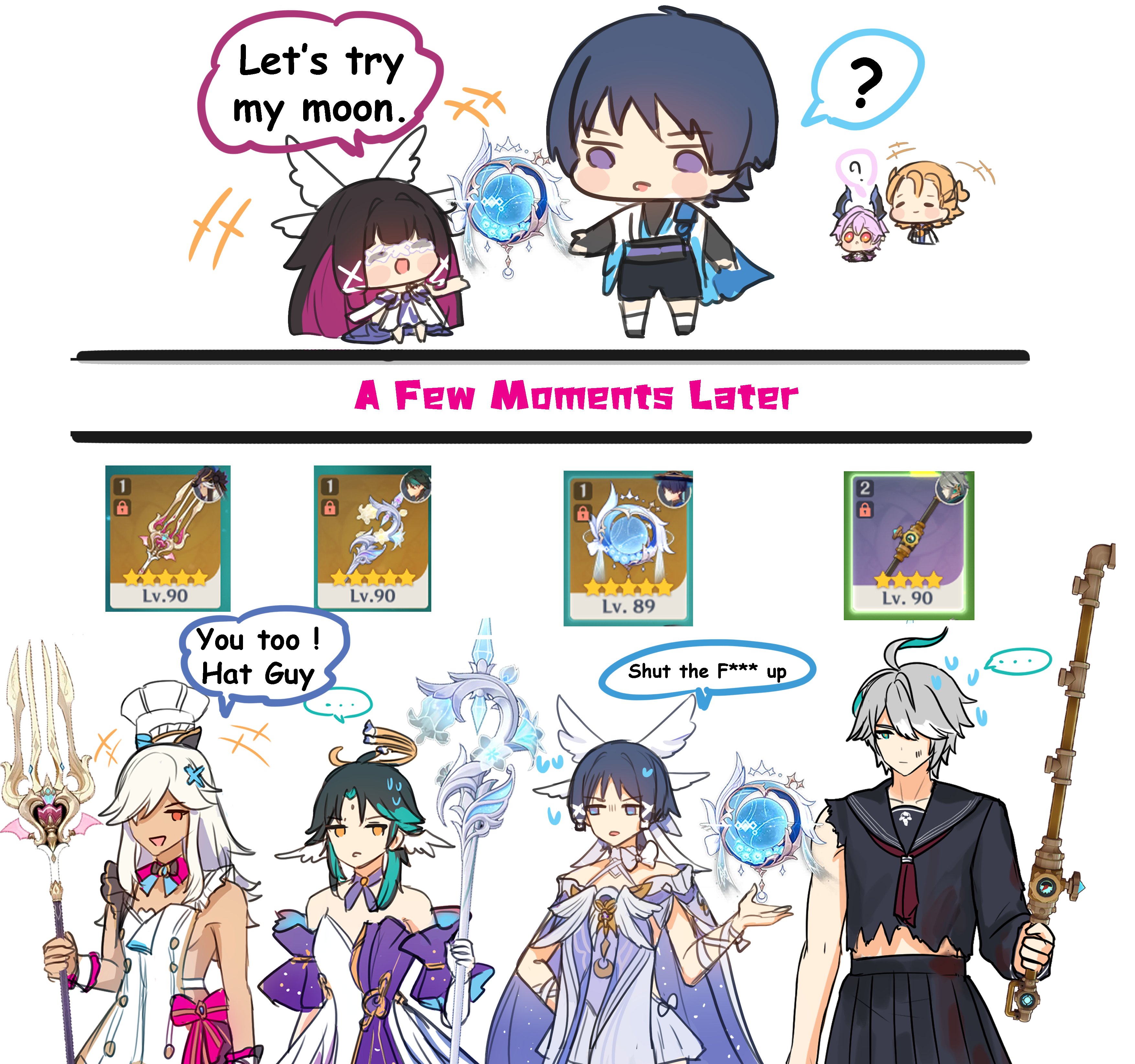 >5 minutes of beautiful moon goddesses>2 hours of dragon twink and hat twink acknowledging that dragon twink has also has abyss powers and abyss powers are different than light powersoh ok