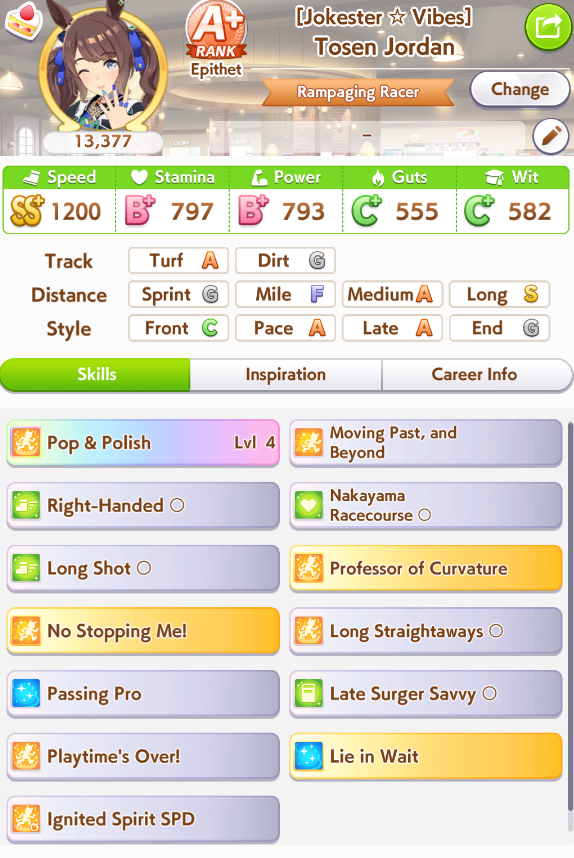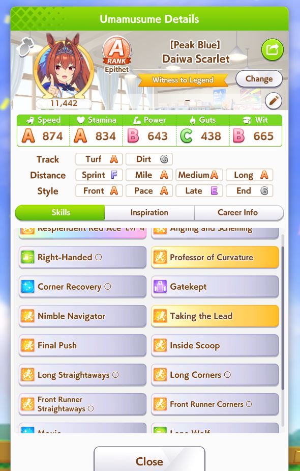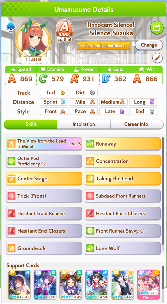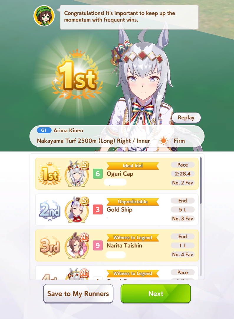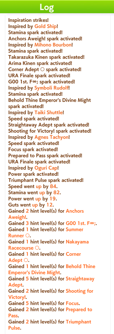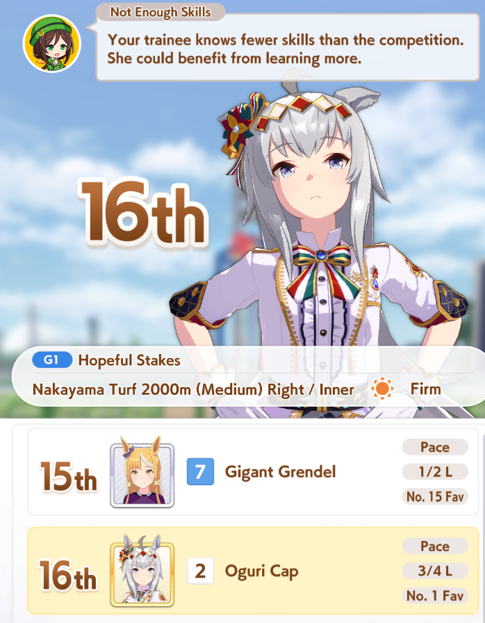 >>554234592>>554234551>>554234625Works good enough she lost the 2 previous races>>554234536>>554234806Thanks, yeah her skills are a bit RNG but it seems consistent enough at least >>554235036I always have to go for a Gold cause I use R Riko and wanna use power spark parents so it was expected>>554235706idk people here said it was good so I buy it and I think ignited speed is good but expensive I had Fast Learner so I bought it